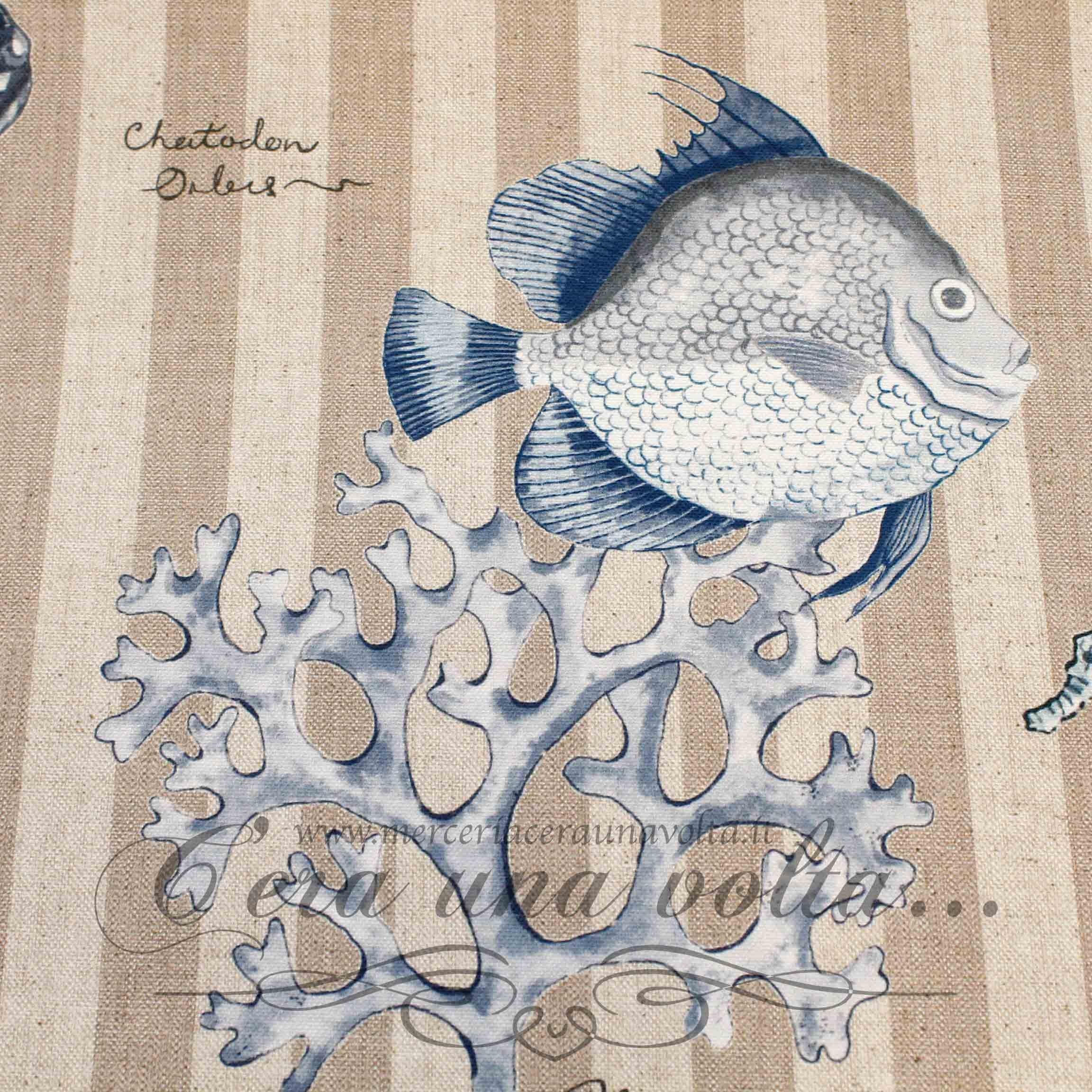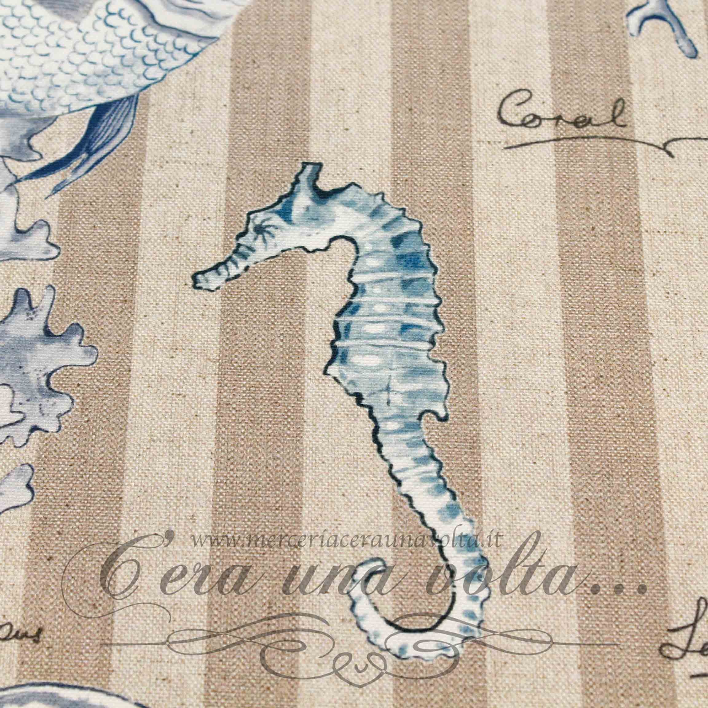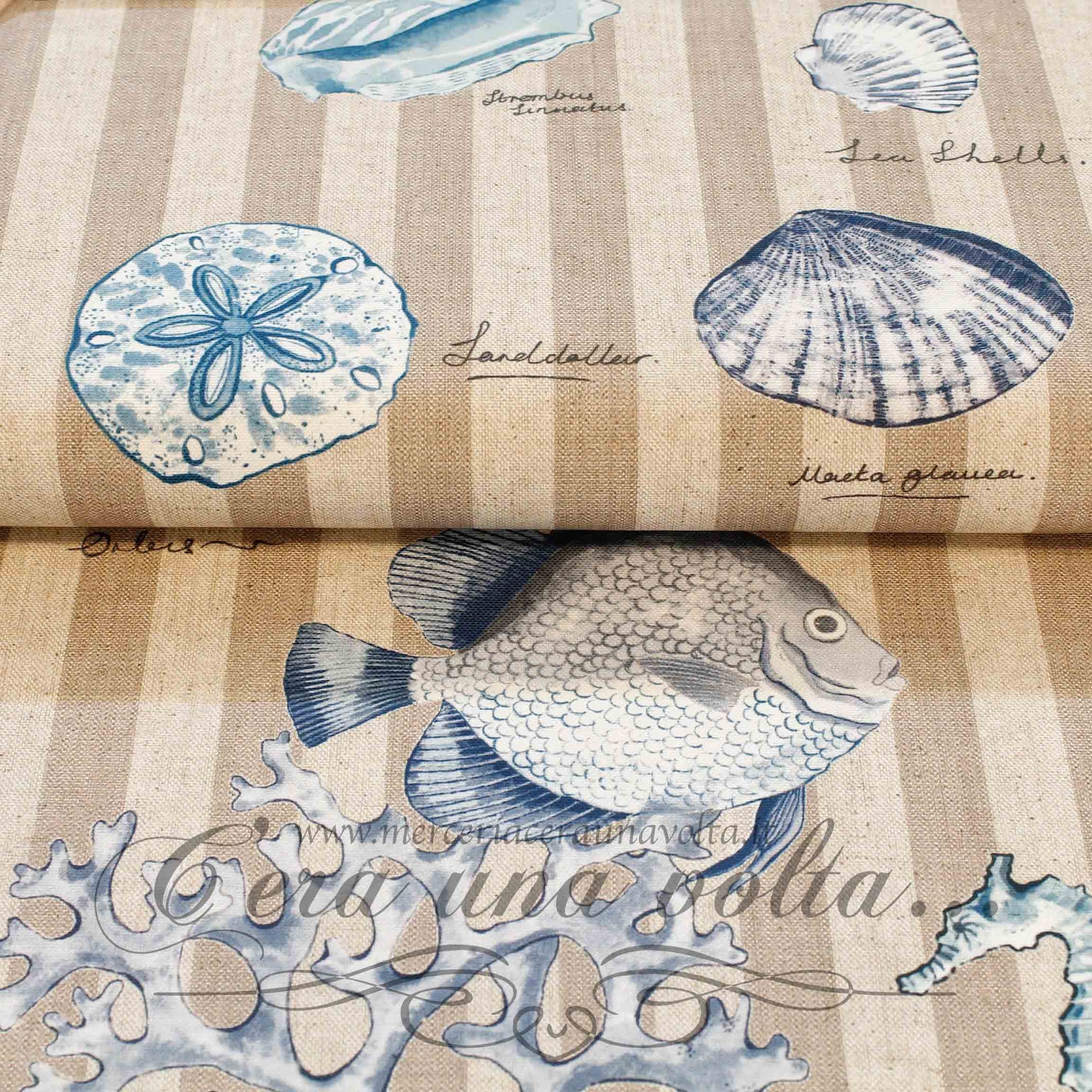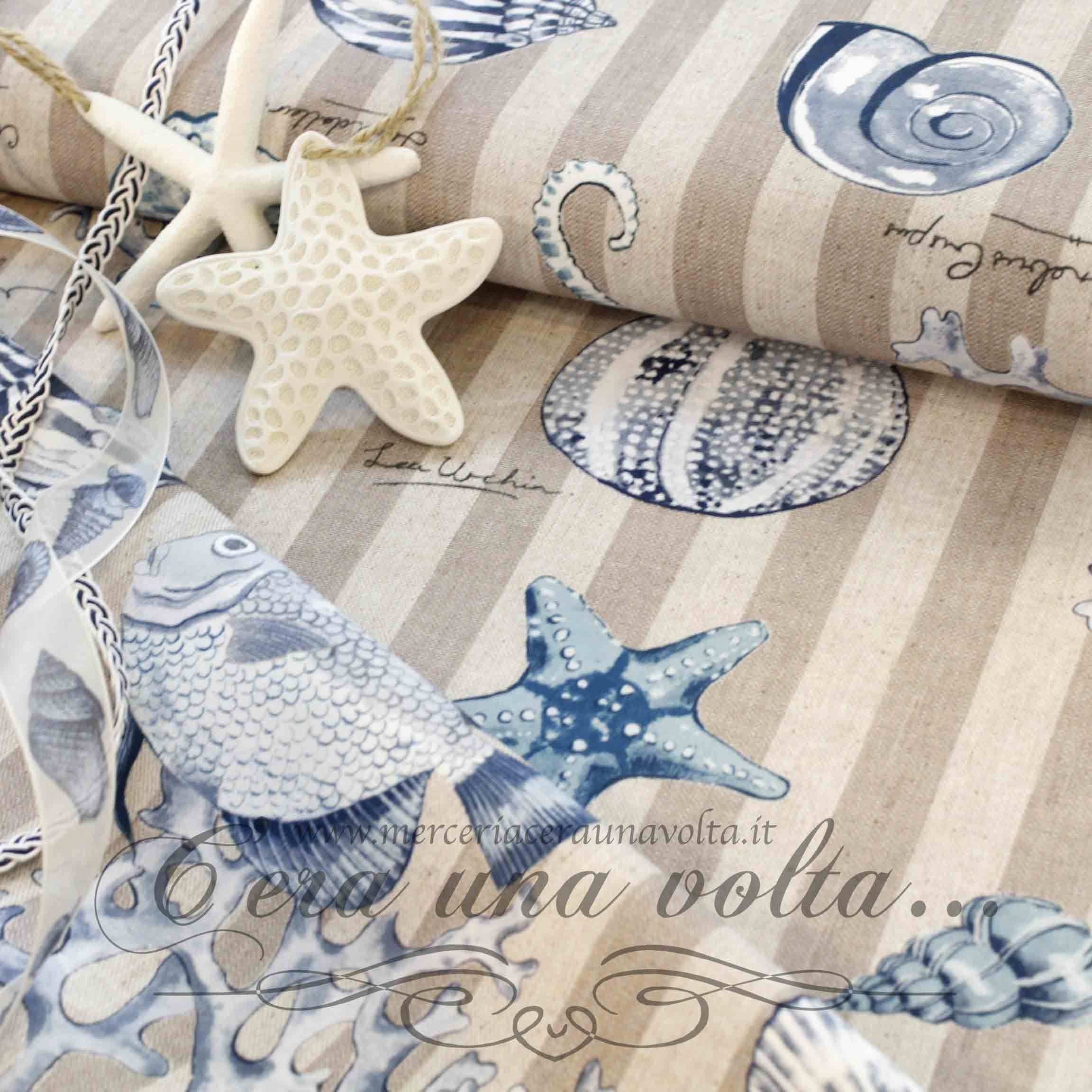 Tessuto antimacchia Sea, l'atmosfera estiva sottolineata da un'esprit fresco e brioso, la stampa propone una selezione di piacevoli elementi marini...