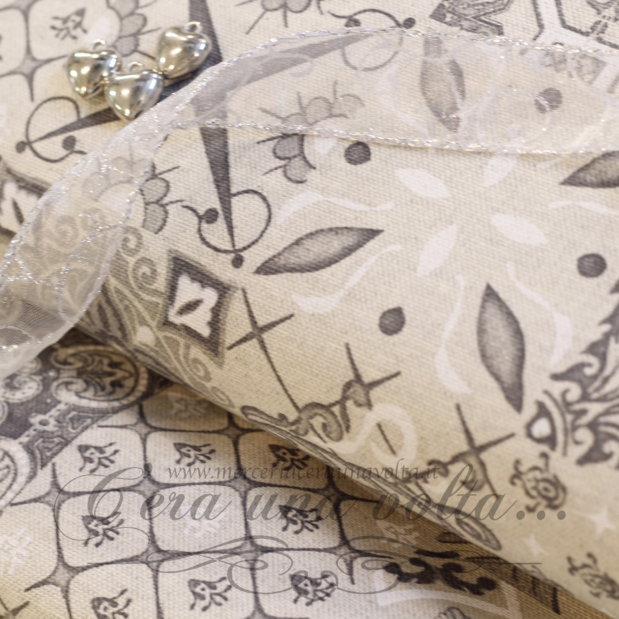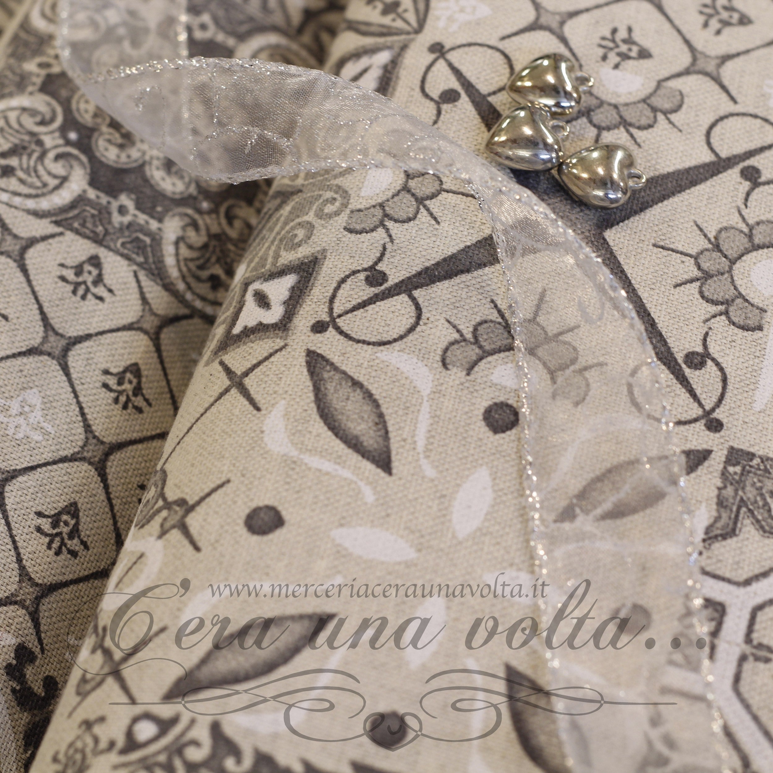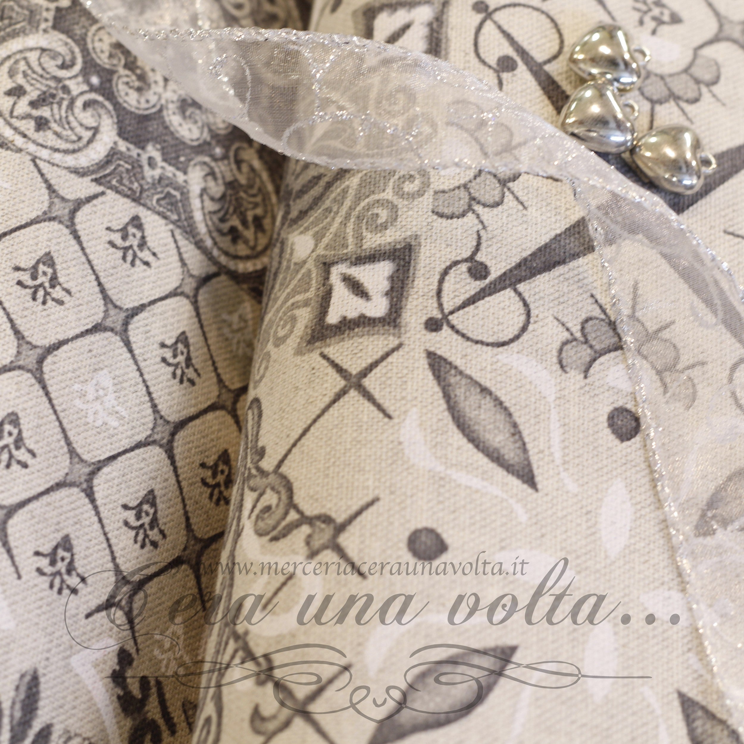Mattonelle chiamate Azulejos, tipiche dell'architettura portoghese, interpretano questo tessuto dalle tenui tonalità di Grigio e Beige, declinate in varie nuances, donando all'ambiente un tocco di originalità.