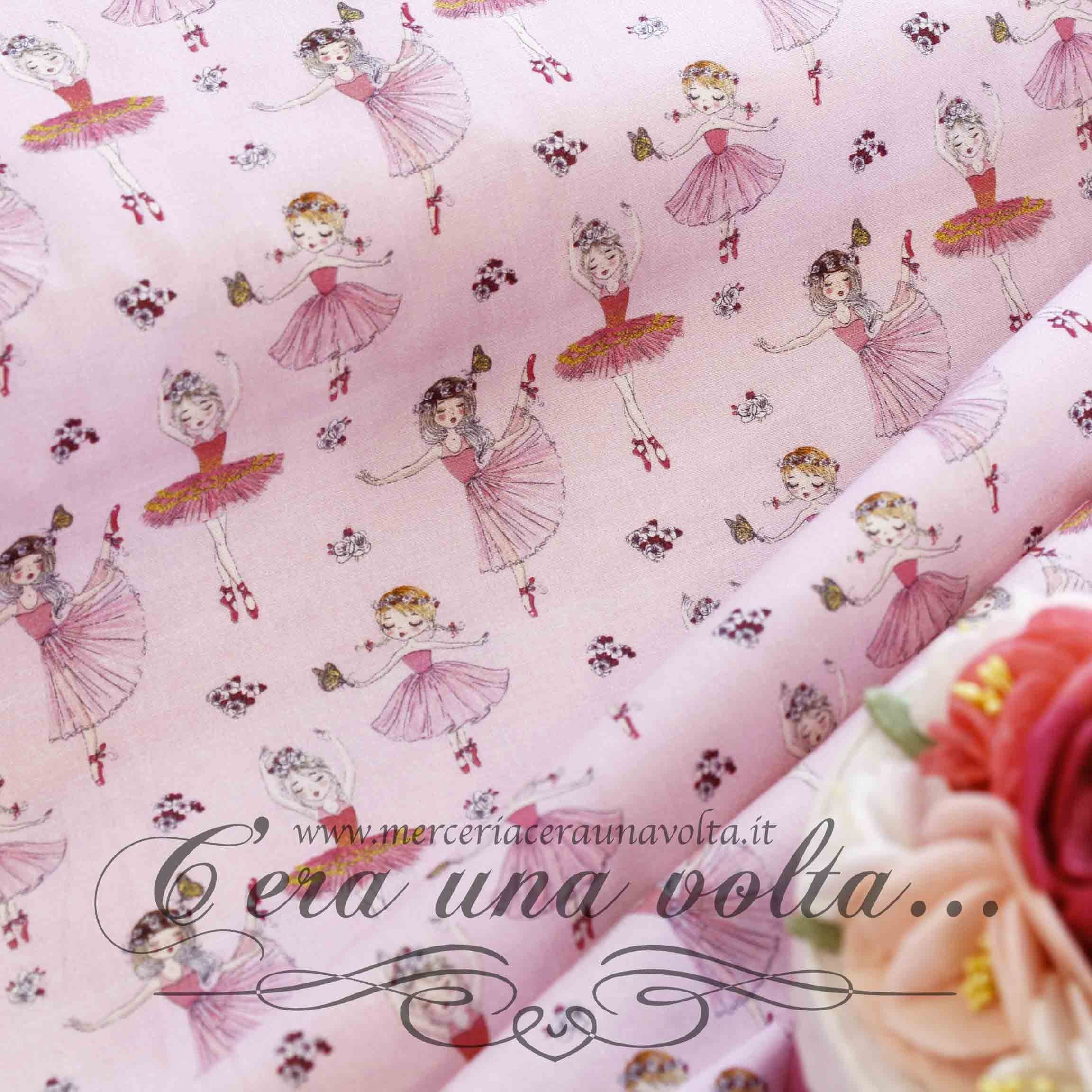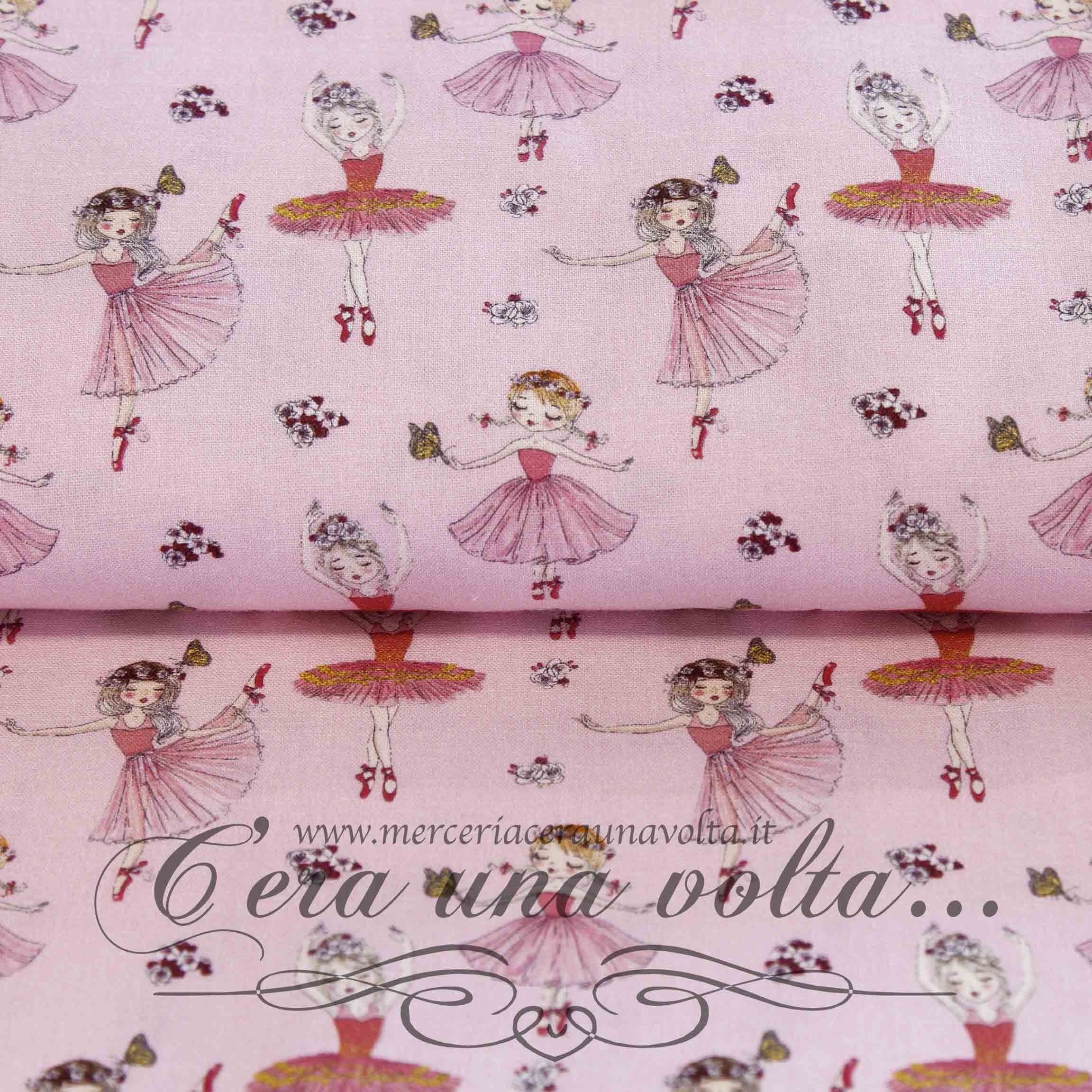 Pirouette, giravolte e casquet, bellissime ballerine in punta di piedi in questo tessuto in cotone adatto a creare un'atmosfera da favola.