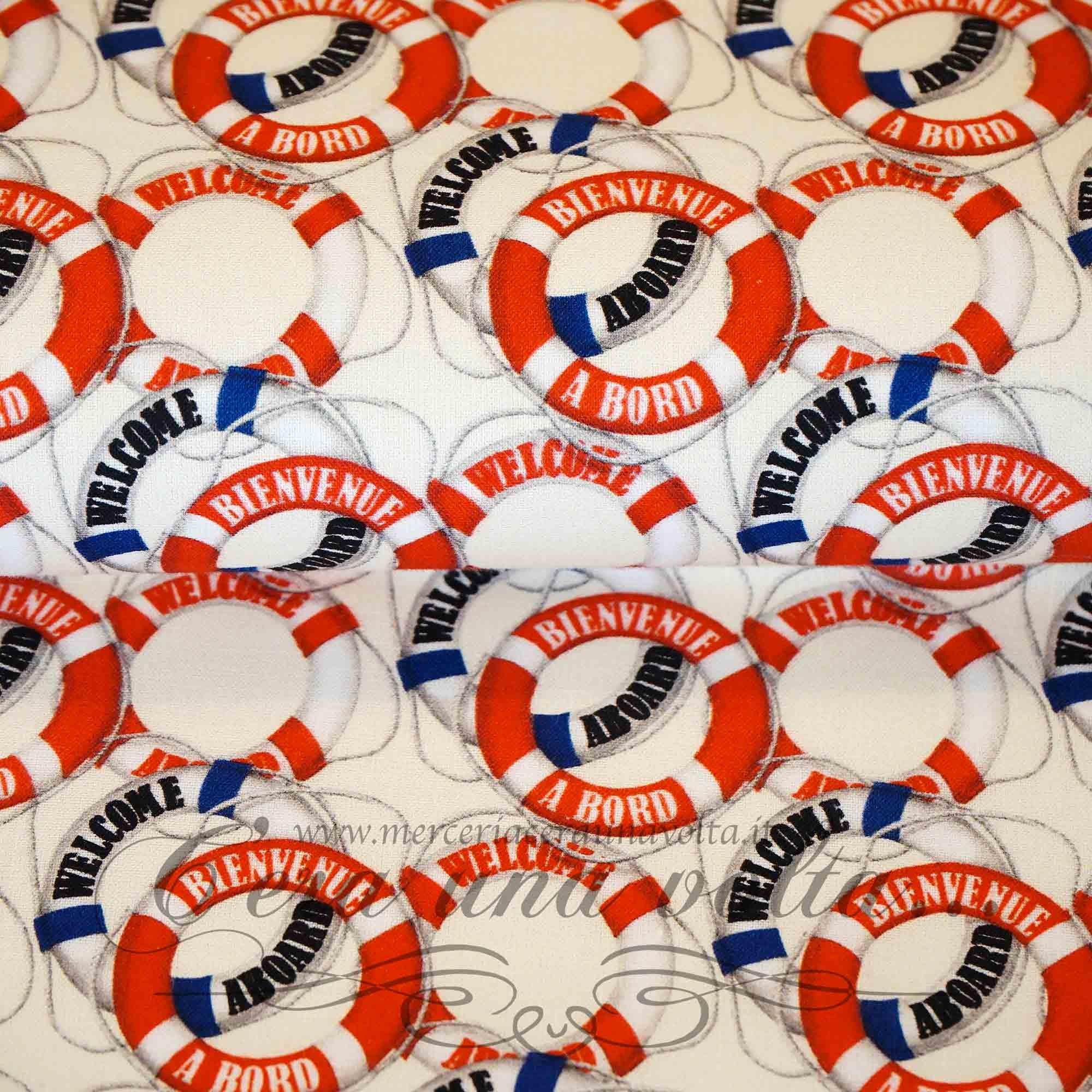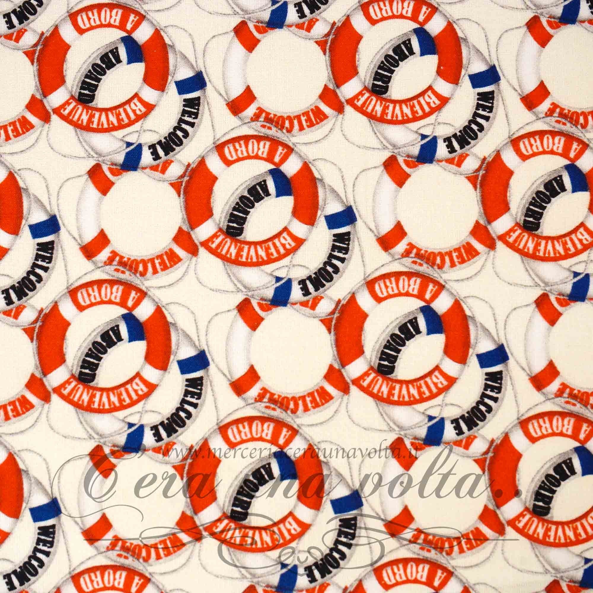 Salvagenti colorati nelle classiche tonalità estive Rosso e Blu sono i protagonisti indiscussi di questo tessuto in cotone, perfetto per regalare alle vostre creazioni lo charme dell'estate.