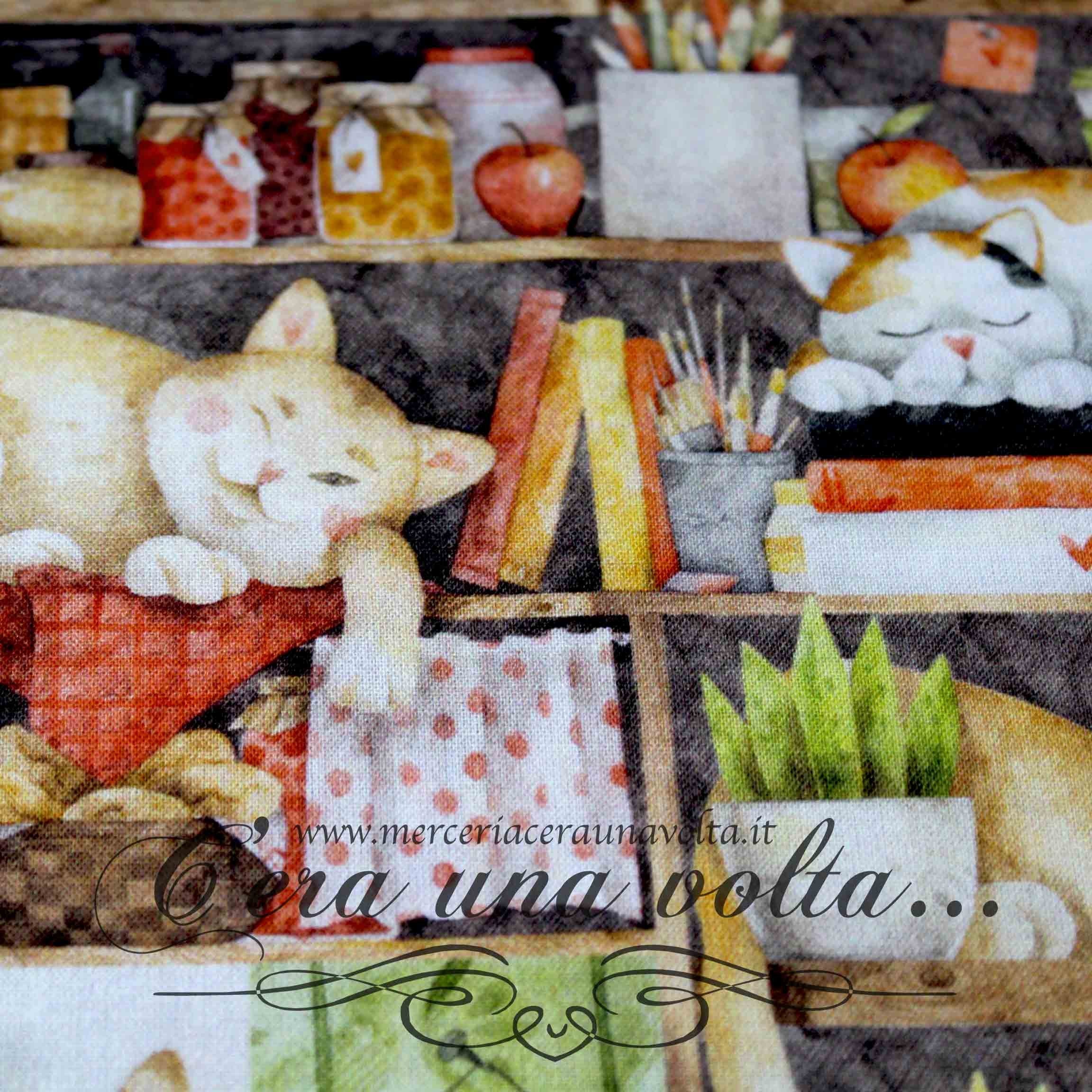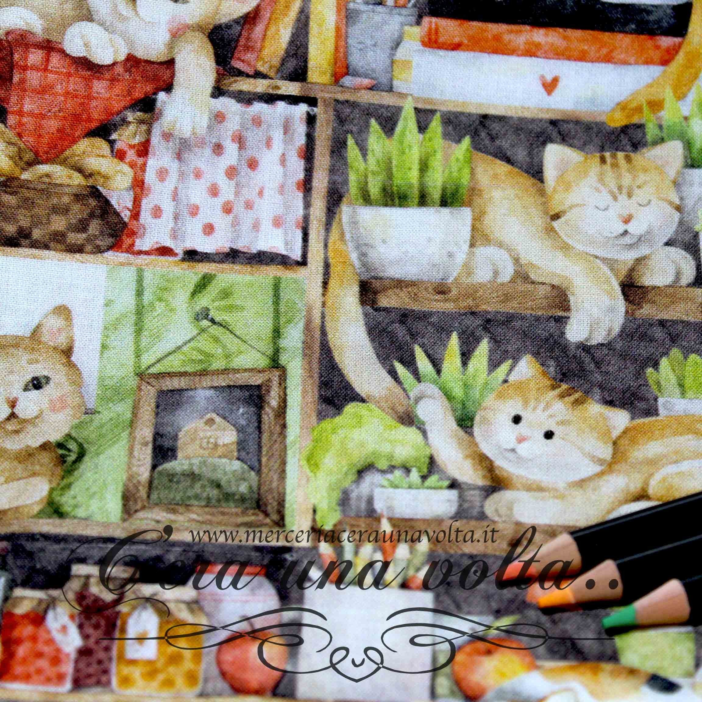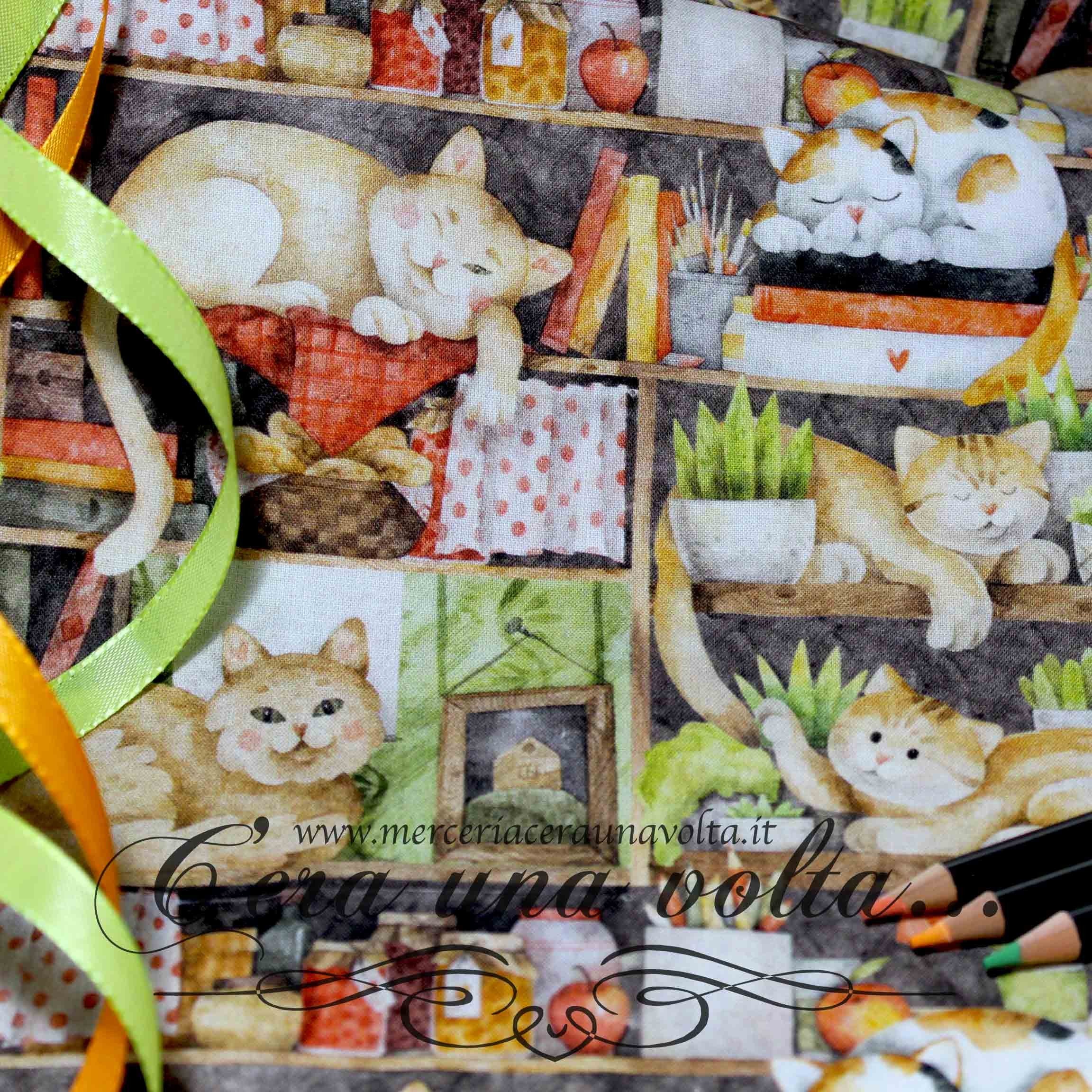 La quotidianità più lenta e semplice del vivere non può che essere ispirata da questi simpatici felini, colori frizzanti suggeriscono un'atmosfera giocosa, aggiungendo una nota di allegria al tessuto