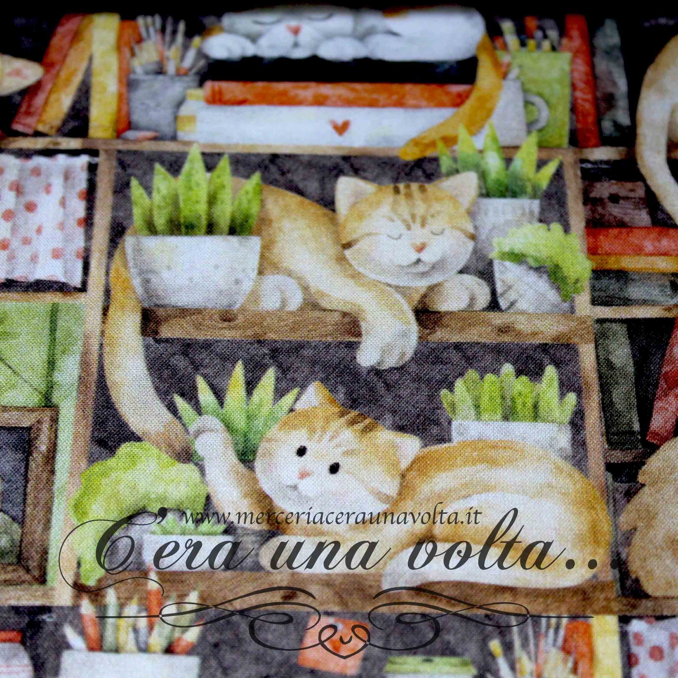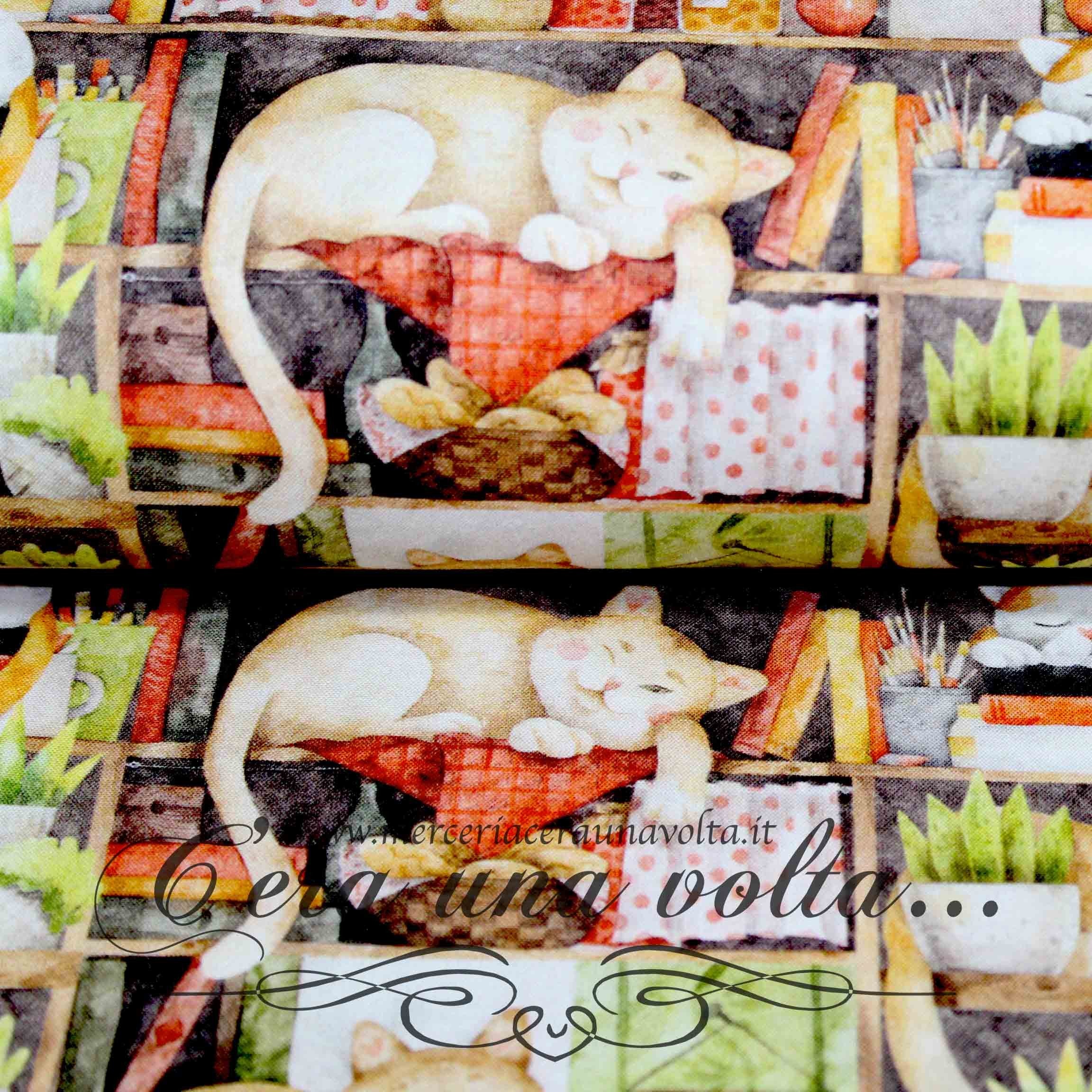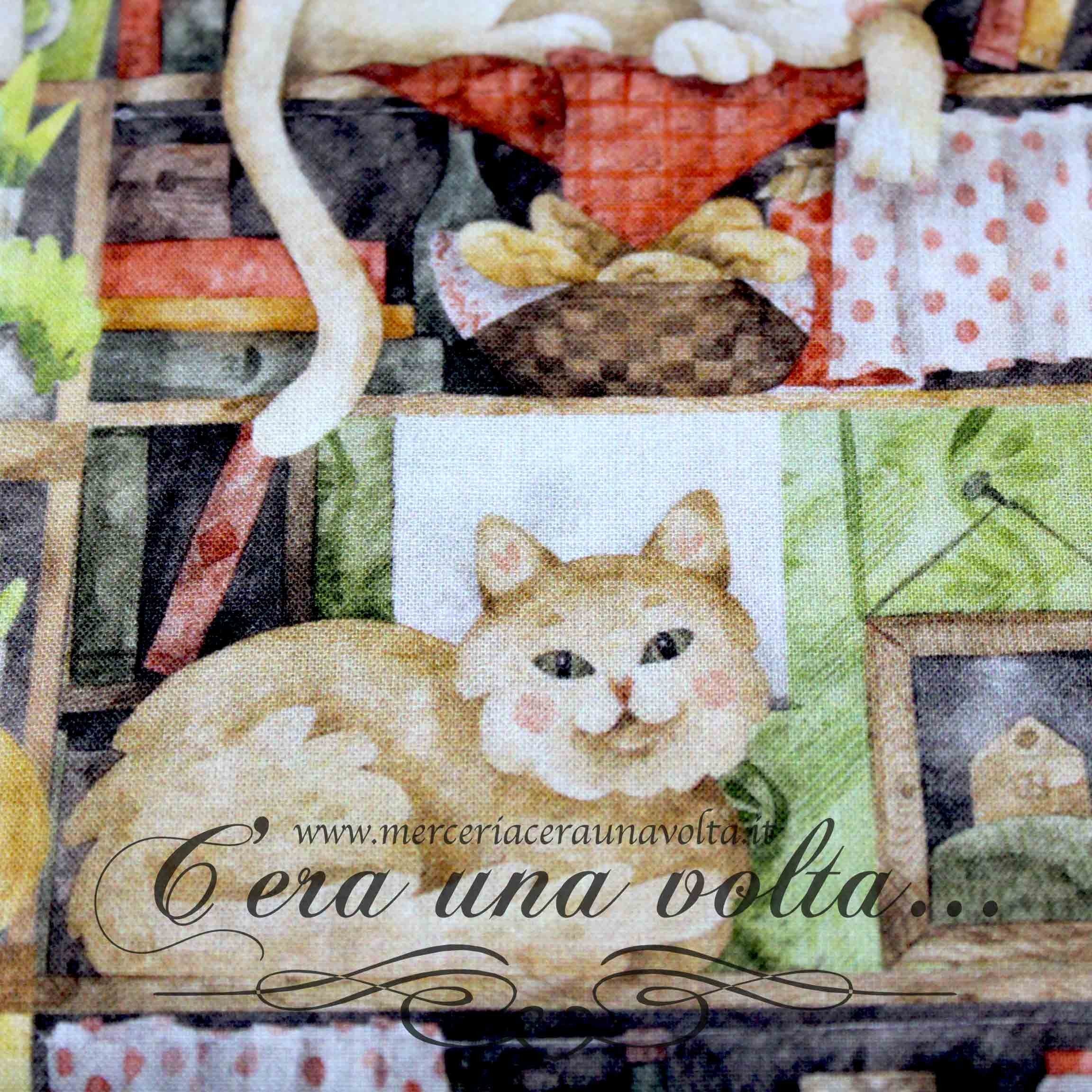 La quotidianità più lenta e semplice del vivere non può che essere ispirata da questi simpatici felini, colori frizzanti suggeriscono un'atmosfera giocosa, aggiungendo una nota di allegria al tessuto