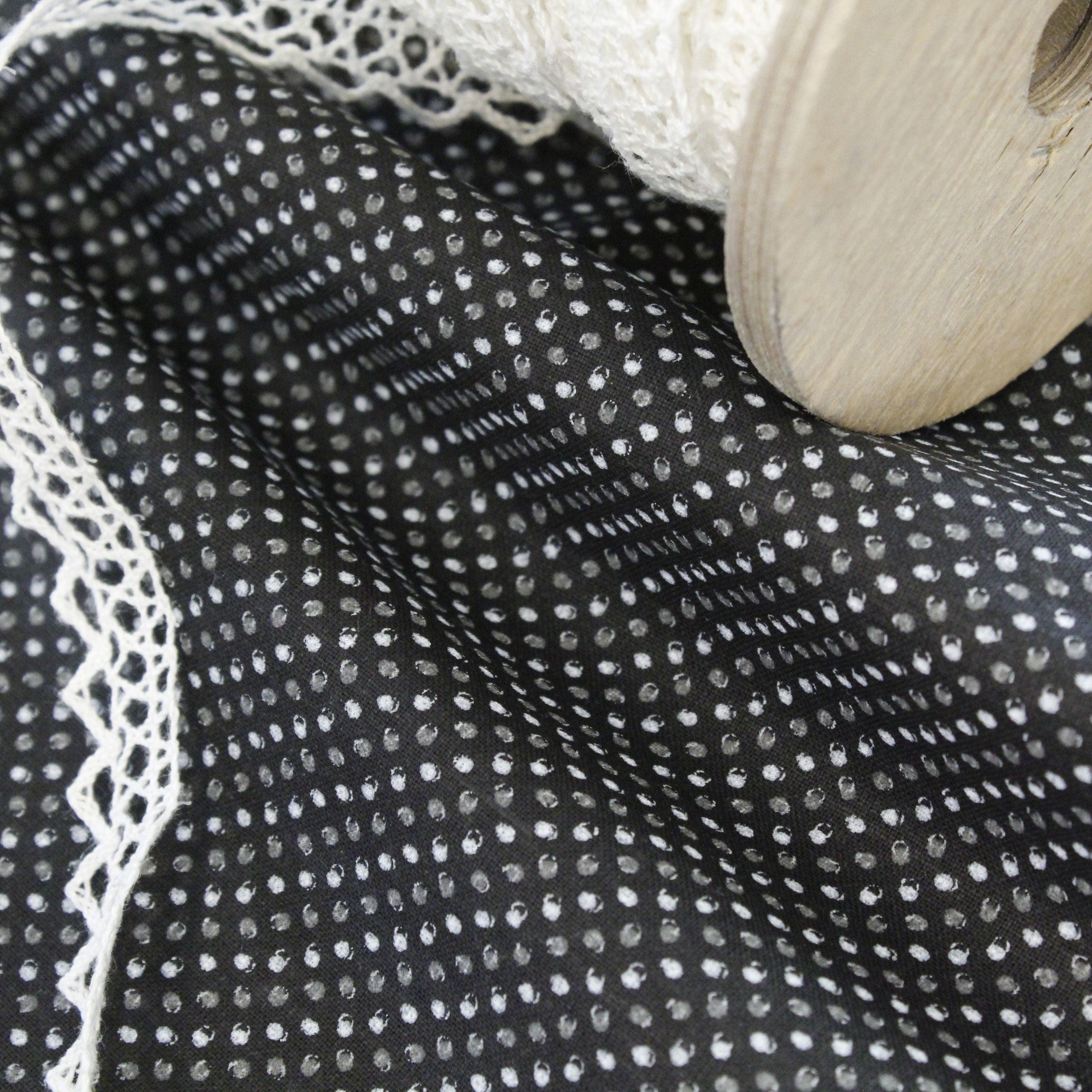 Tessuto in cotone Pois, particolare Ardesia e Grigio su fondo nero, per un look divertente e originale, perfetto per camicie e abbigliamento estivo.