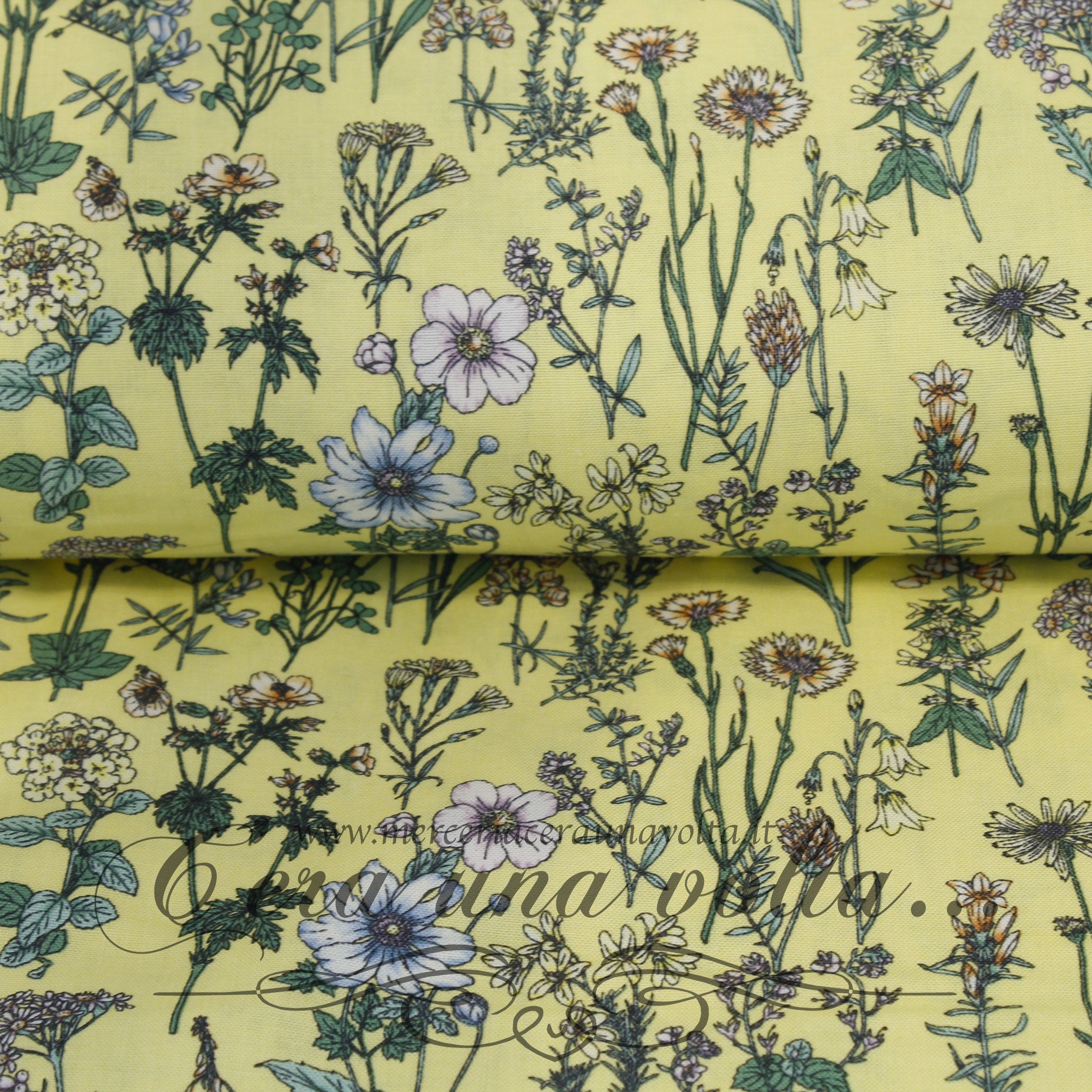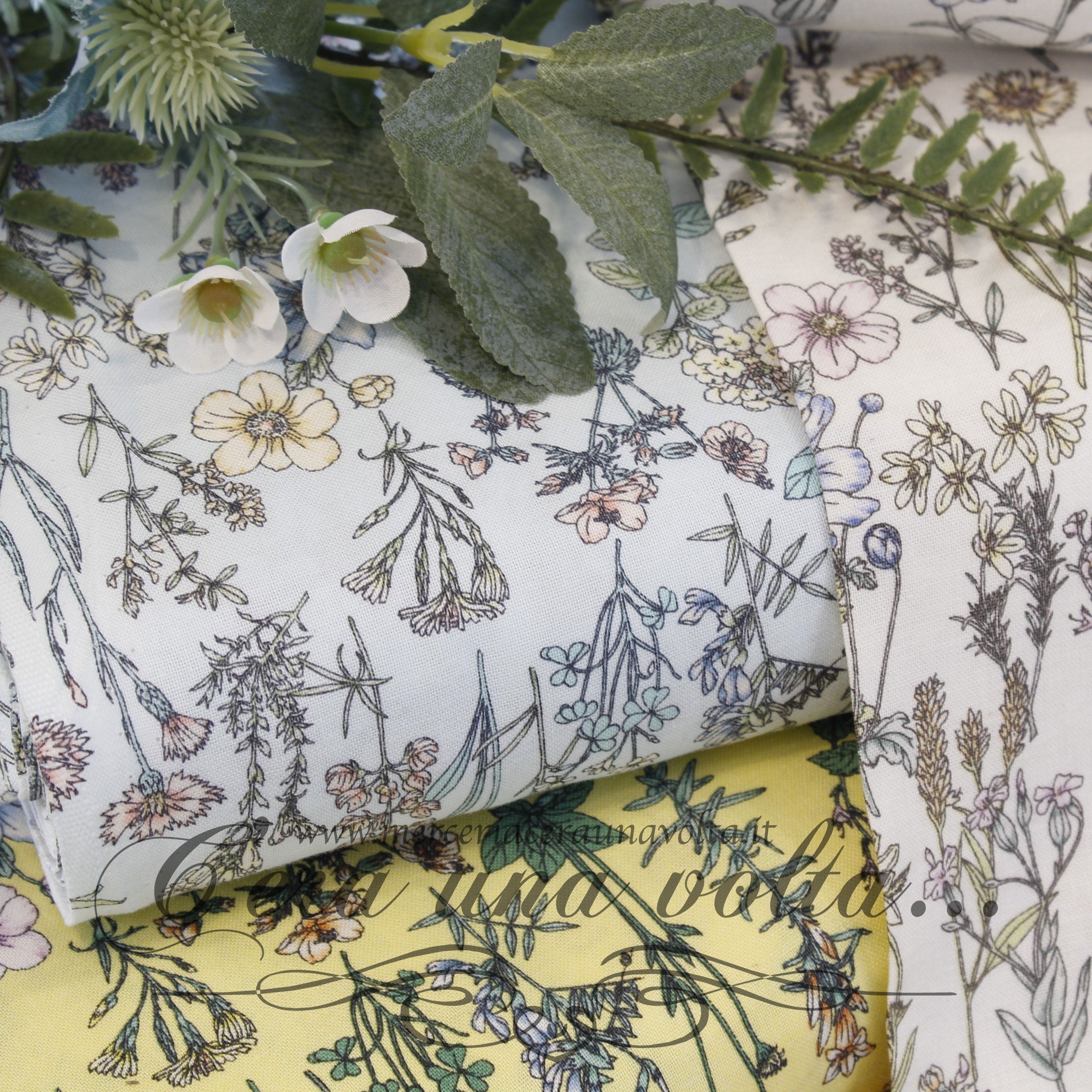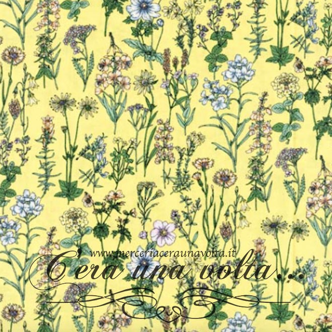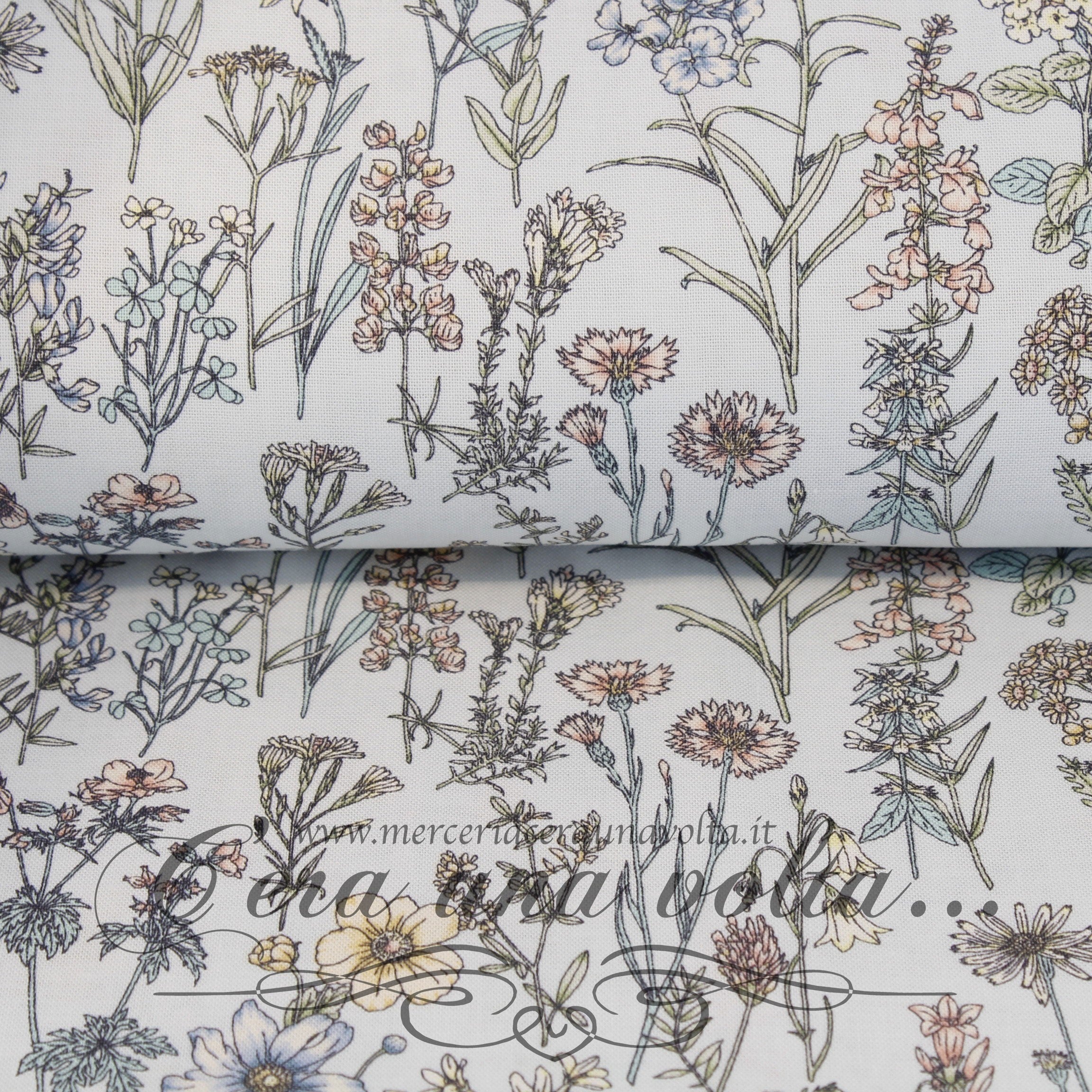 Tessuto Giapponese della linea Lecien "Memorie a Paris", arte botanica floreale stampata su un fondo pastello, colore e stampe must...