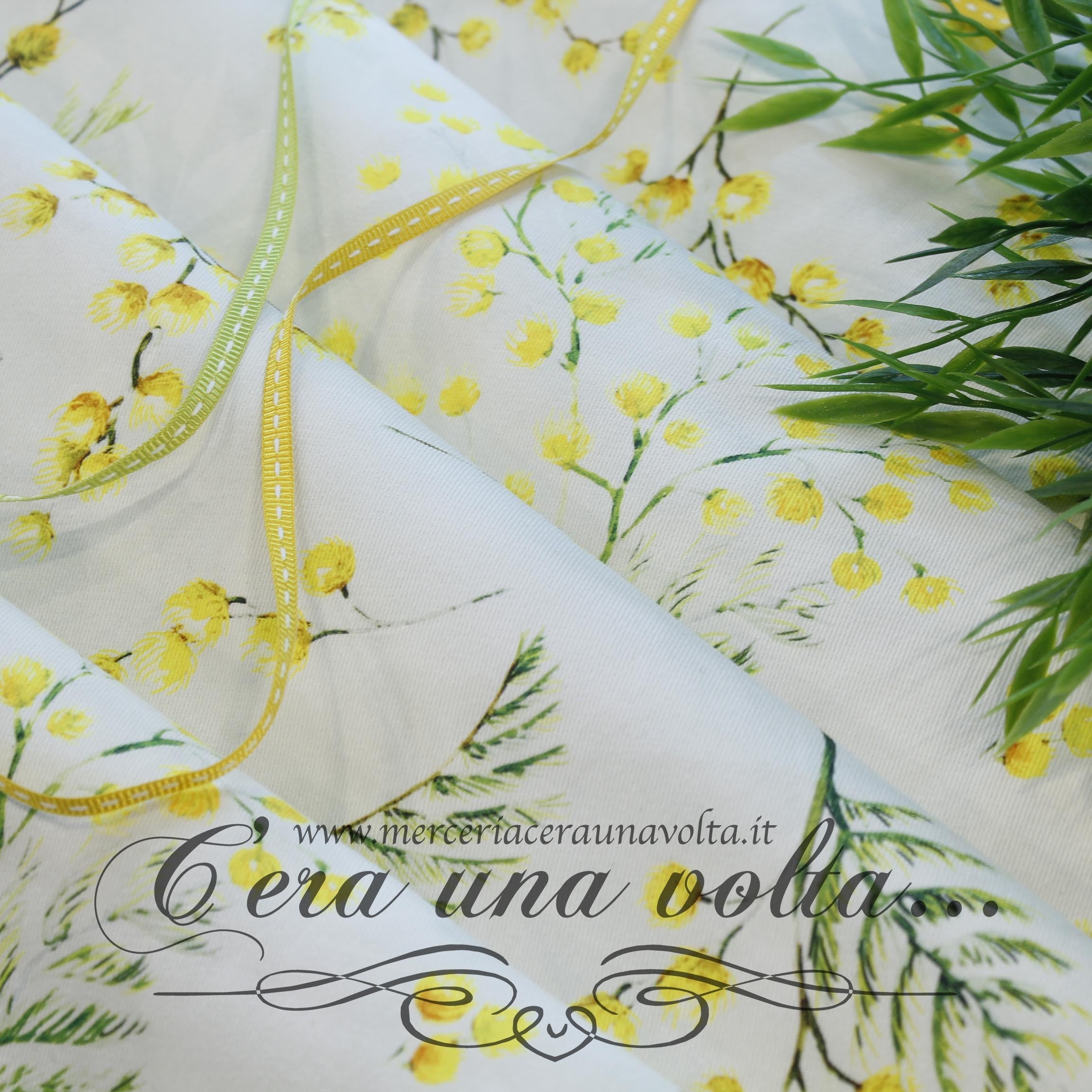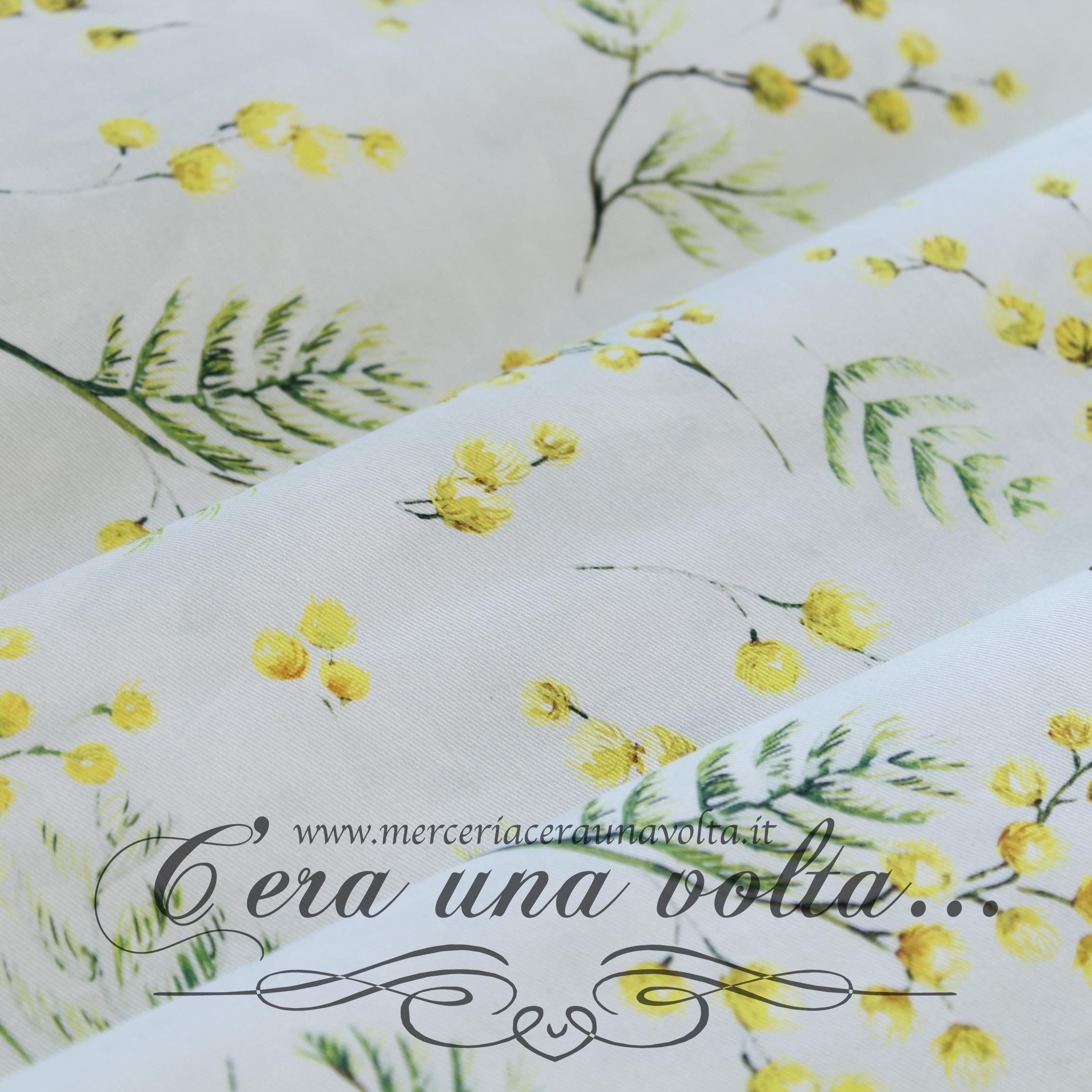 Tessuto Mimosa, fiori gialli raggruppati in grappoli si posa su una base bianca, una stampa che cattura lo sguardo con freschezza e semplicità