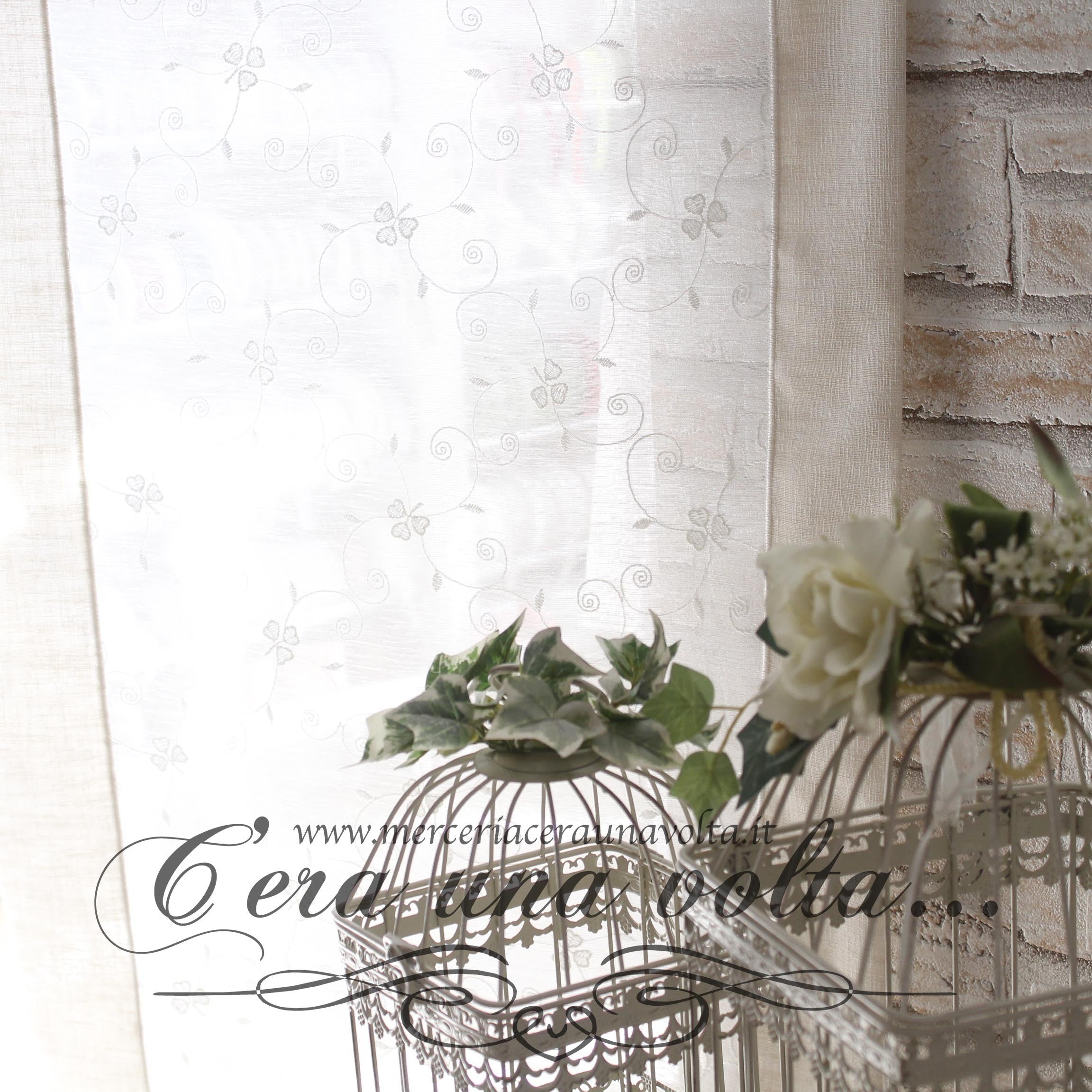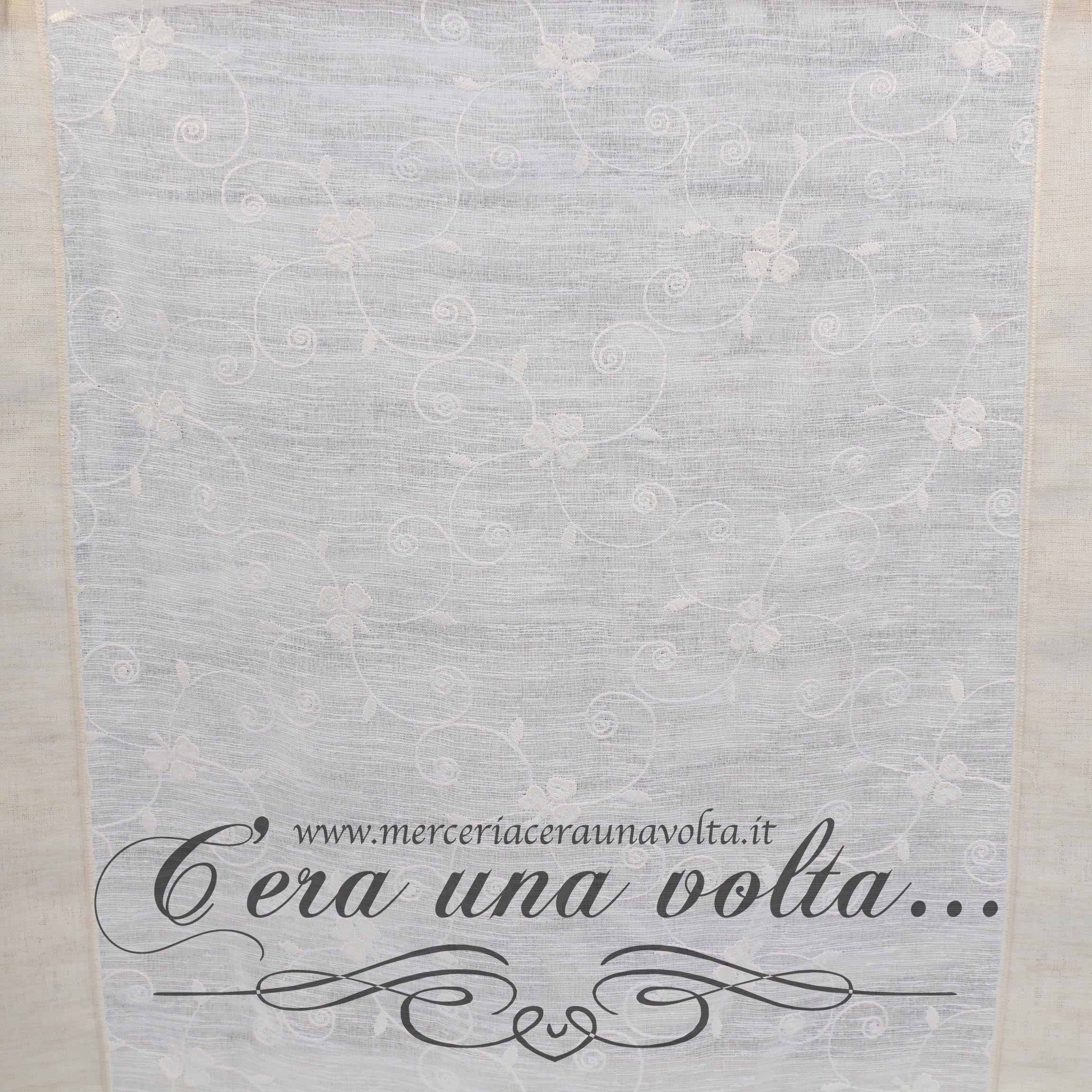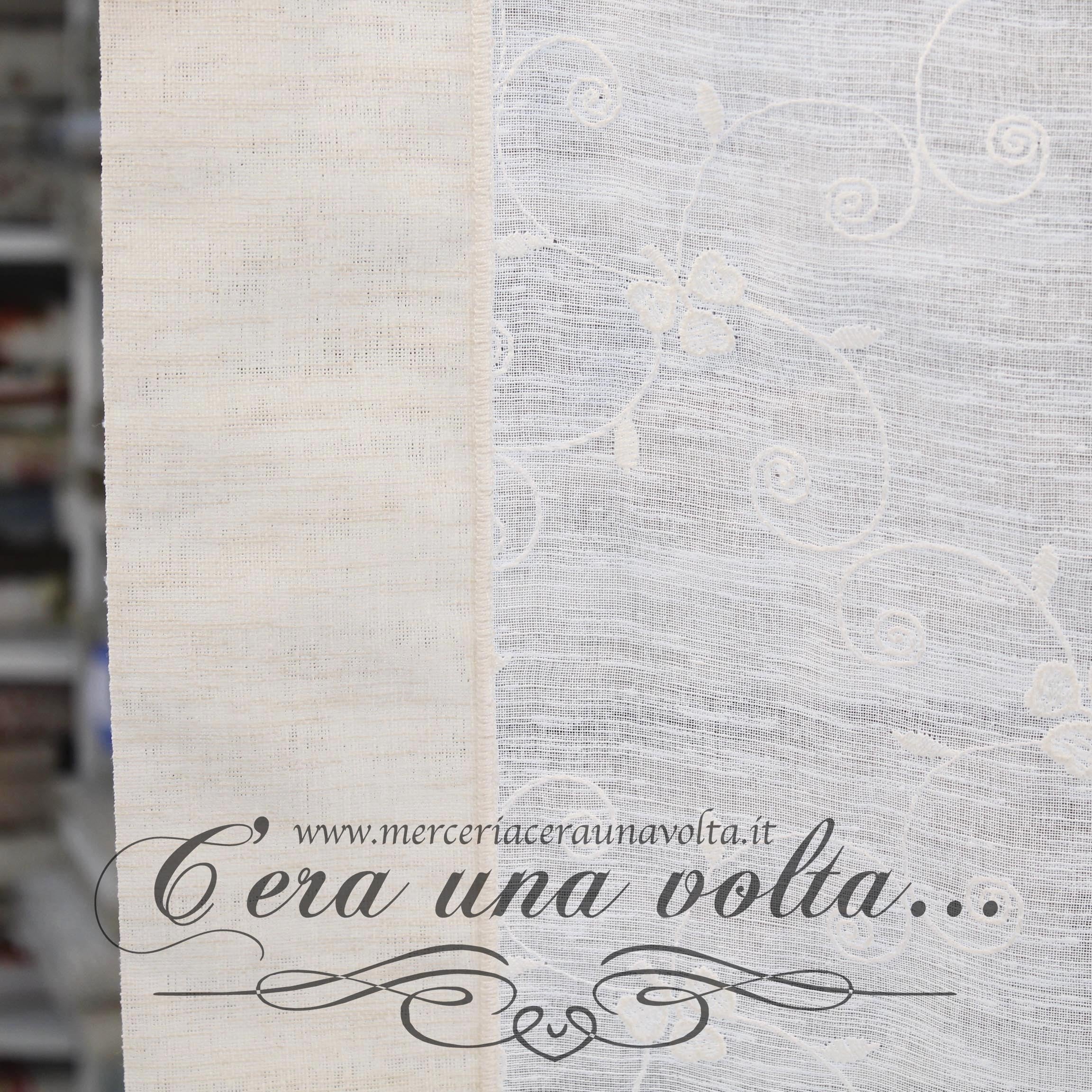 Tessuto per tende già rifinito da entrambi i lati con romantici fiori a rilievo, con un bordo di 4,5 cm in colore a contrasto, semplicissima da confezionare, è sufficiente rifinire la parte superiore con della riloga arricciatende, del velcro, oppure con un orlo dove inserire il paletto per appenderle; e la parte inferiore con una cucitura. Realizzabile sia arricciata che tesa, effetto Lino, mano ruvida
