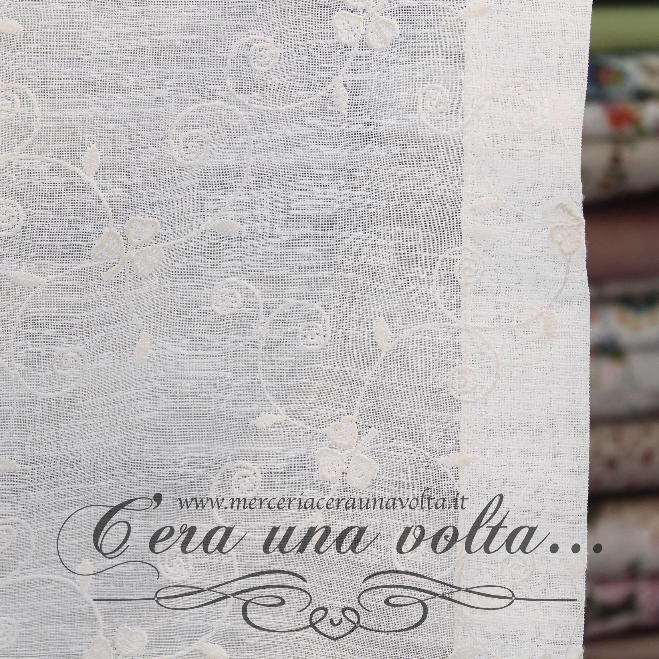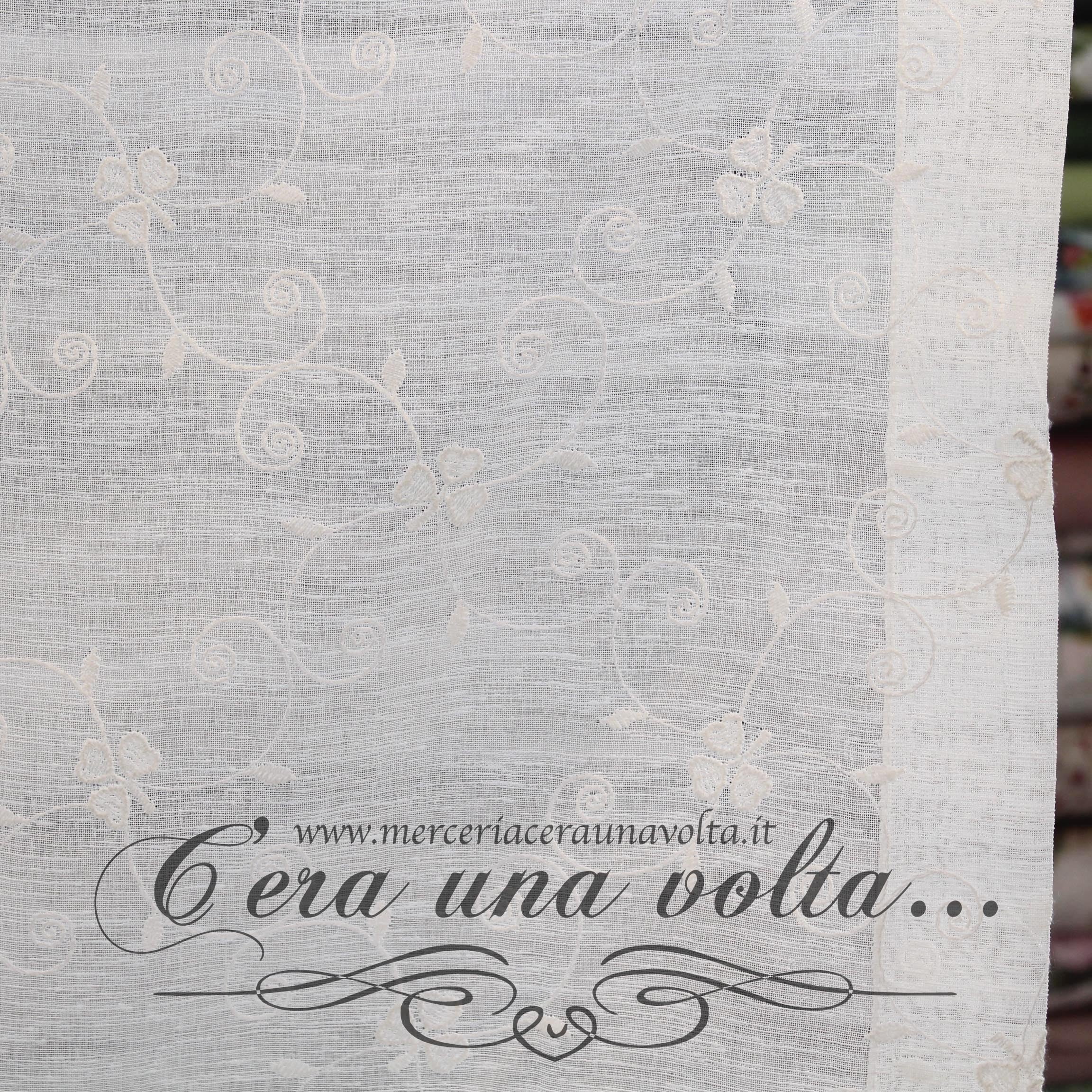 Tessuto per tende già rifinito da entrambi i lati con romantici fiori a rilievo, con un bordo di 4,5 cm, semplicissima da confezionare, è sufficiente rifinire la parte superiore con della riloga arricciatende, del velcro, oppure con un orlo dove inserire il paletto per appenderle; e la parte inferiore con una cucitura. Realizzabile sia arricciata che tesa, effetto Lino, mano ruvida.