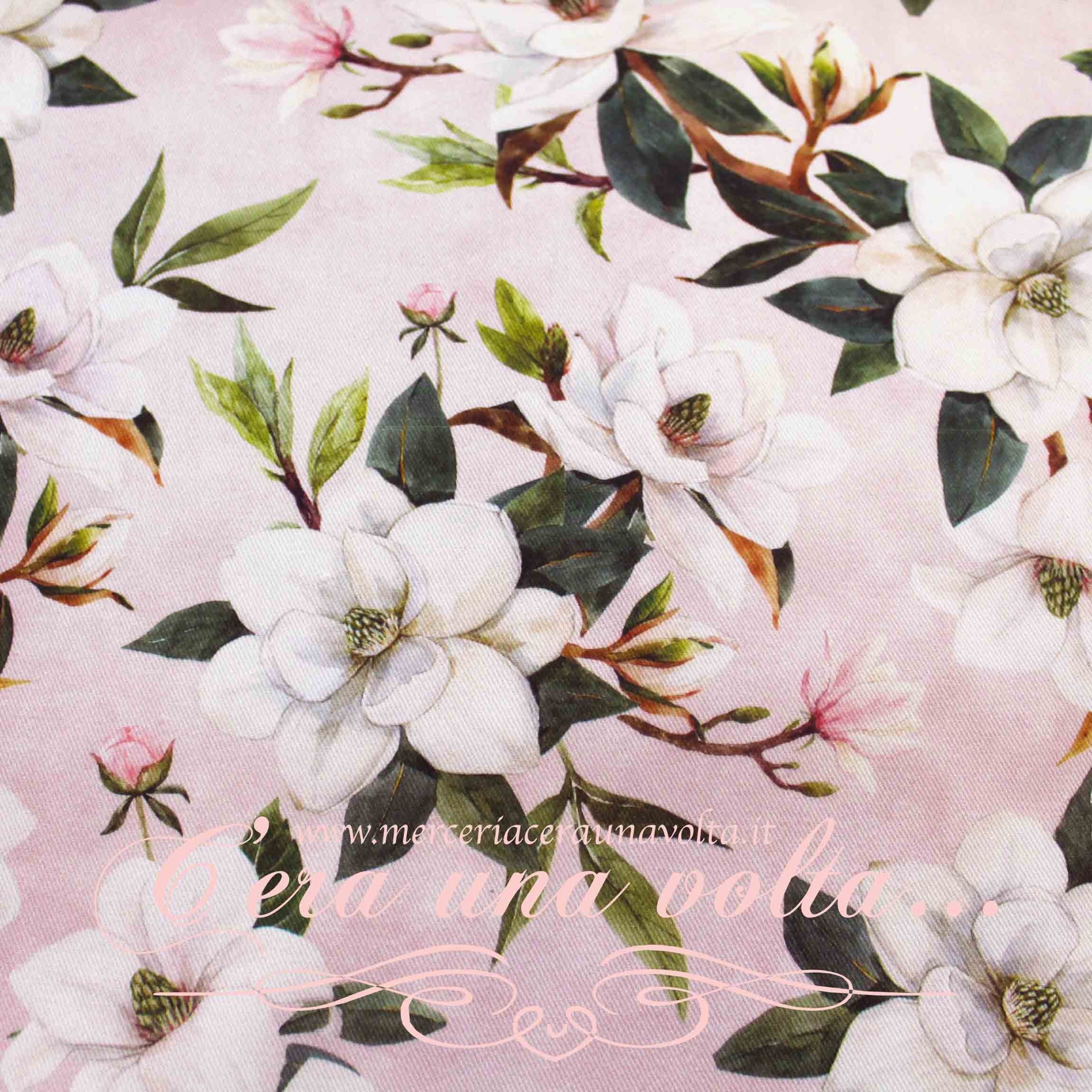 Una pianta ornamentale particolarmente apprezzata per i vistosi e profumati fiori, stampati in questo tessuto che regala una sensazione visiva di grande luminosità ed evoca un'atmosfera di benessere, confort e bellezza.