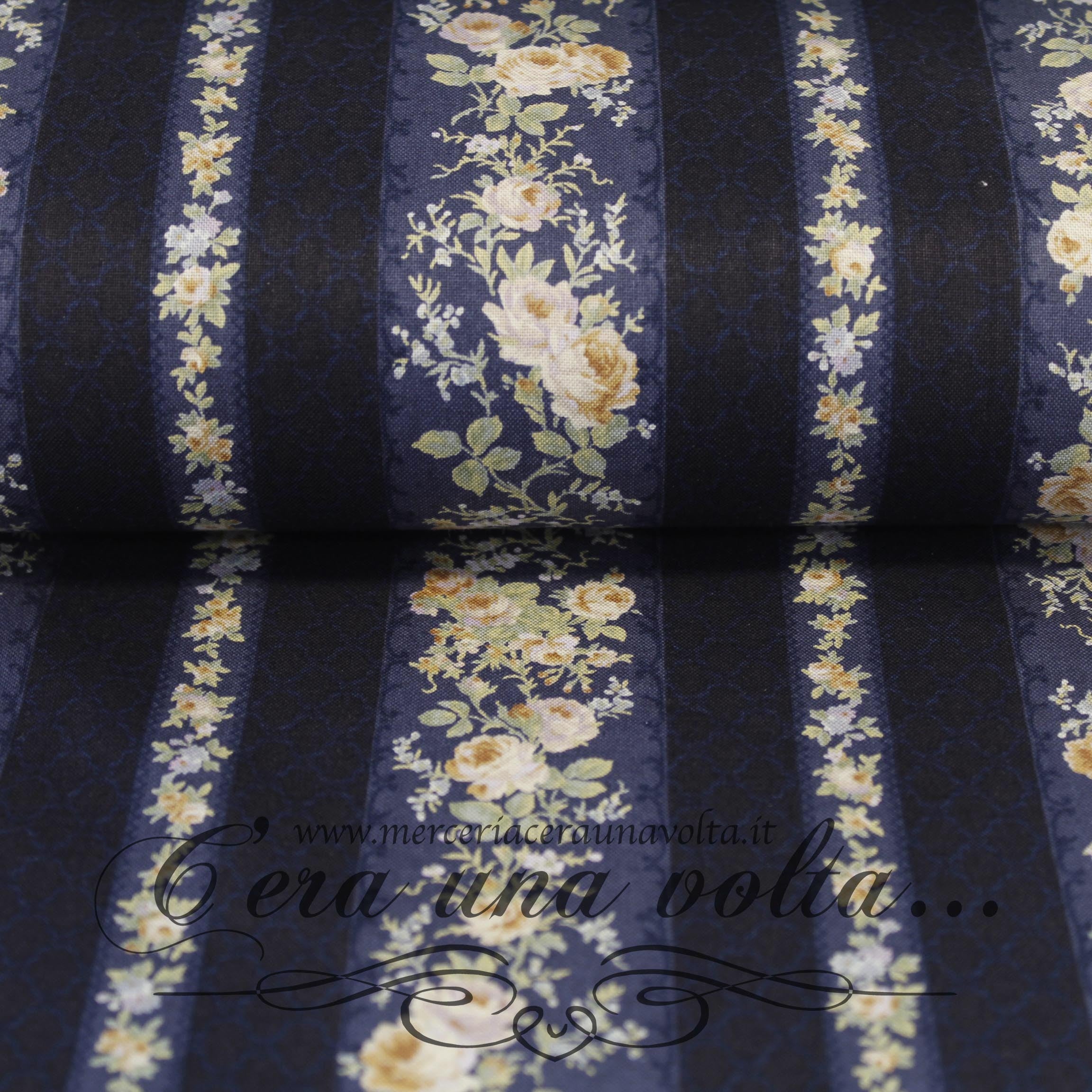 Tessuto Giapponese della nuova collezione Antique Rose di Lecien, romantiche rose shabby chic si intrecciano su un delicato fondo rigato color Blu, perfetto per quilt patchwork e cucito