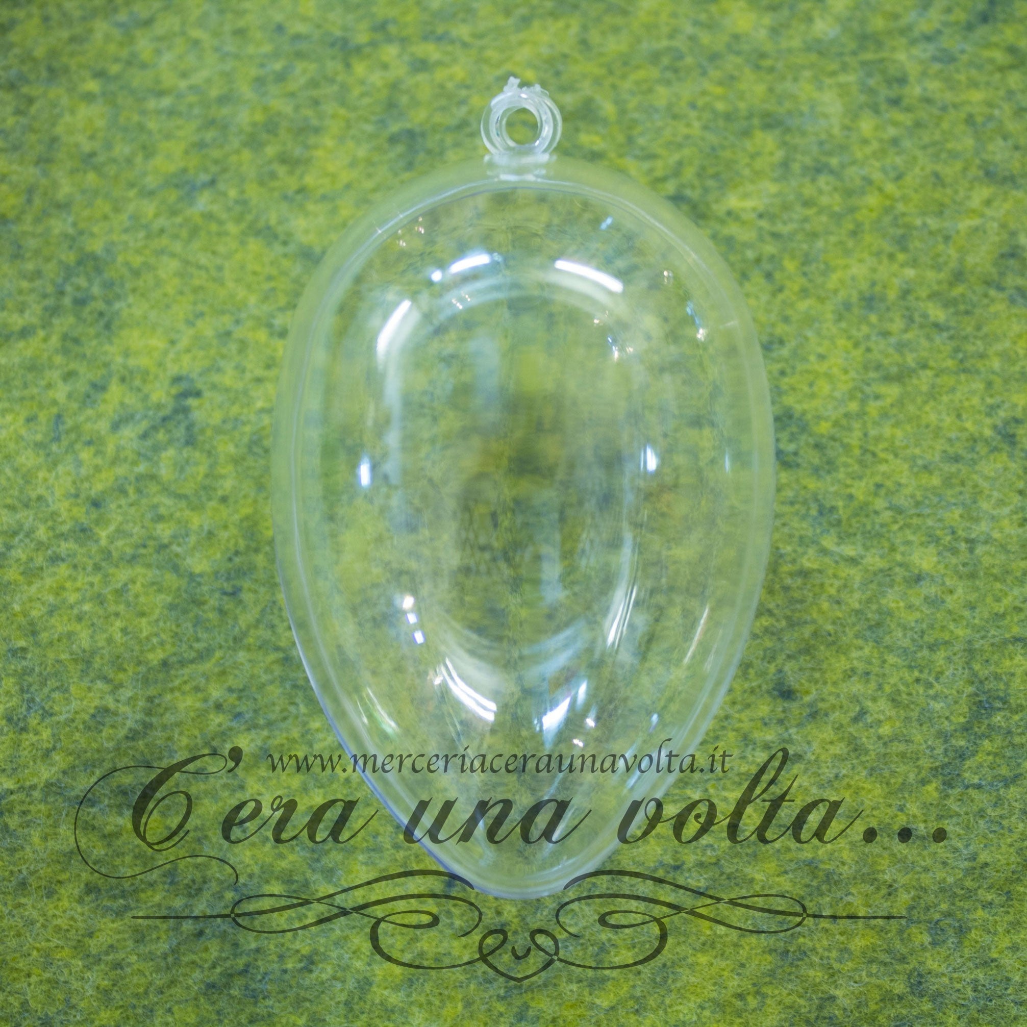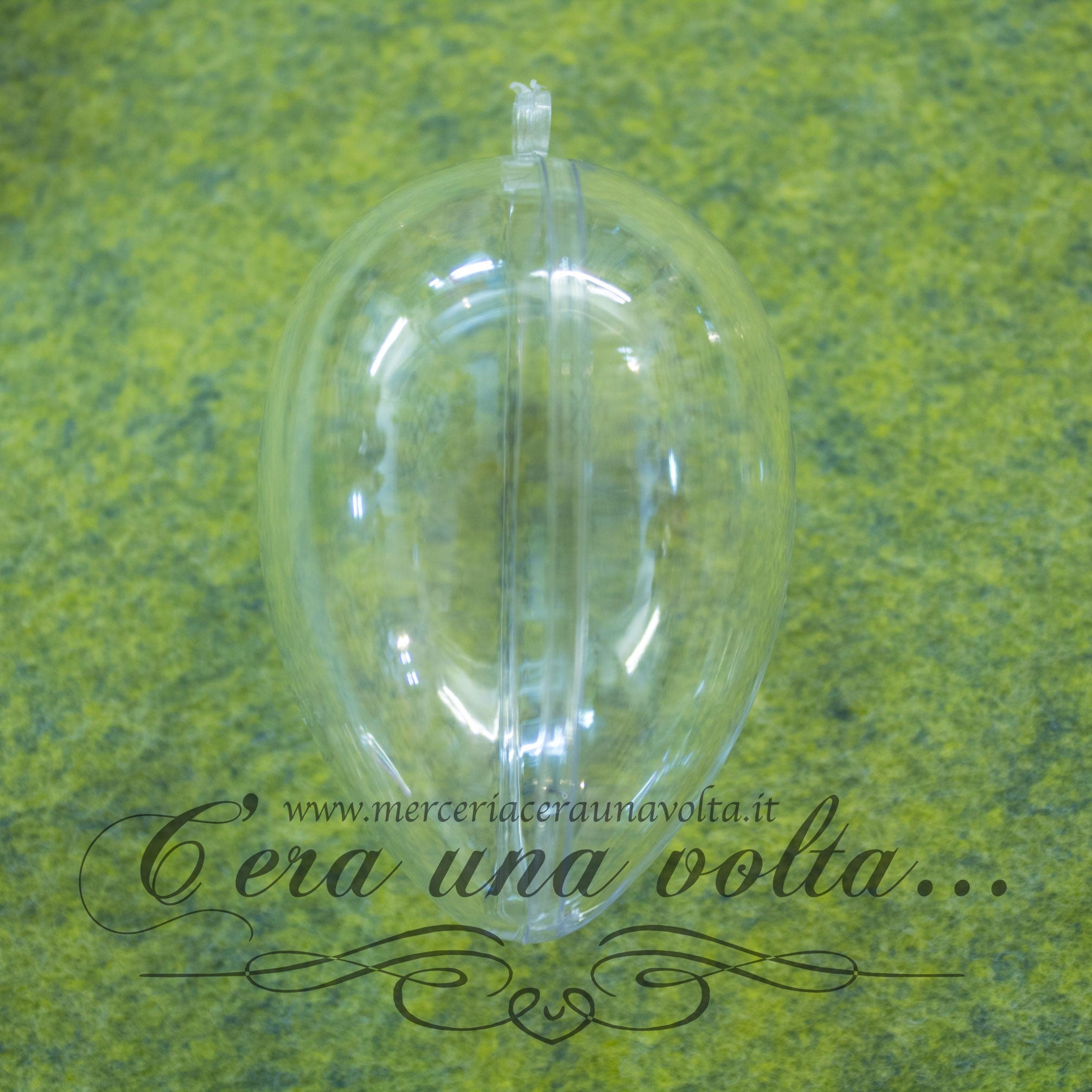 Uovo in plastica trasparente, apribile ad incastro, con comodo anellino per appenderlo, ideale per dècoupage, come contenitore per potpourri, dipinto...