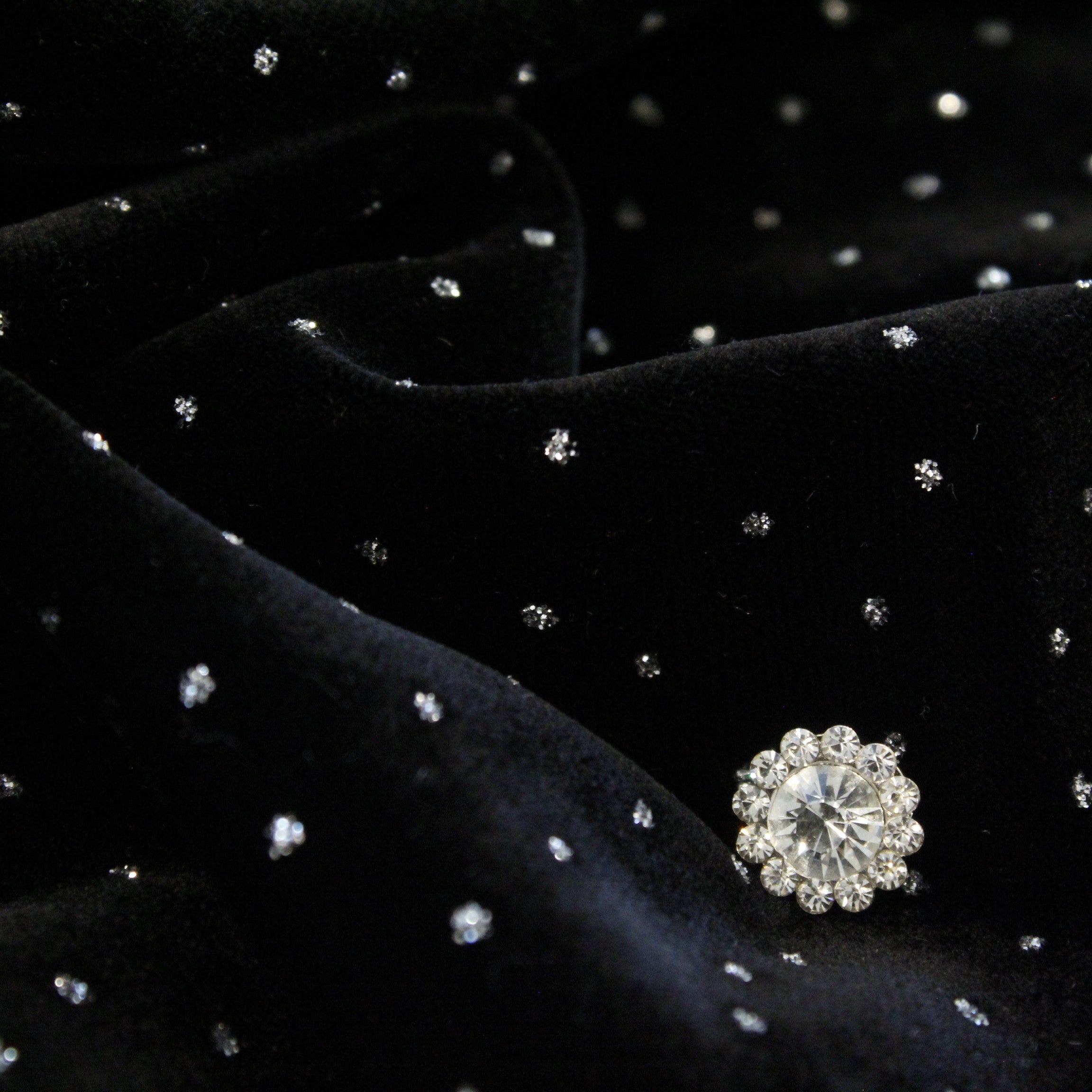 Velluto morbido di alta qualità, superficie compatta e brillante, morbidissimo al tatto, arricchito con puntini di lurex argento.