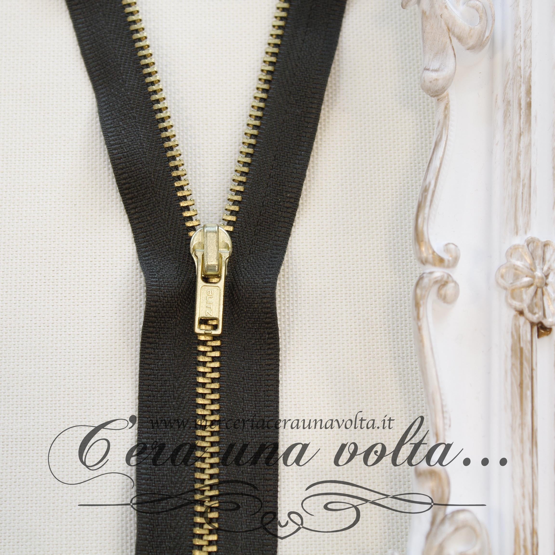 Zip in metallo per pantaloni, catena con dentini in metallo, tranciati e graffati direttamente sui nastri in cotone di supporto,...