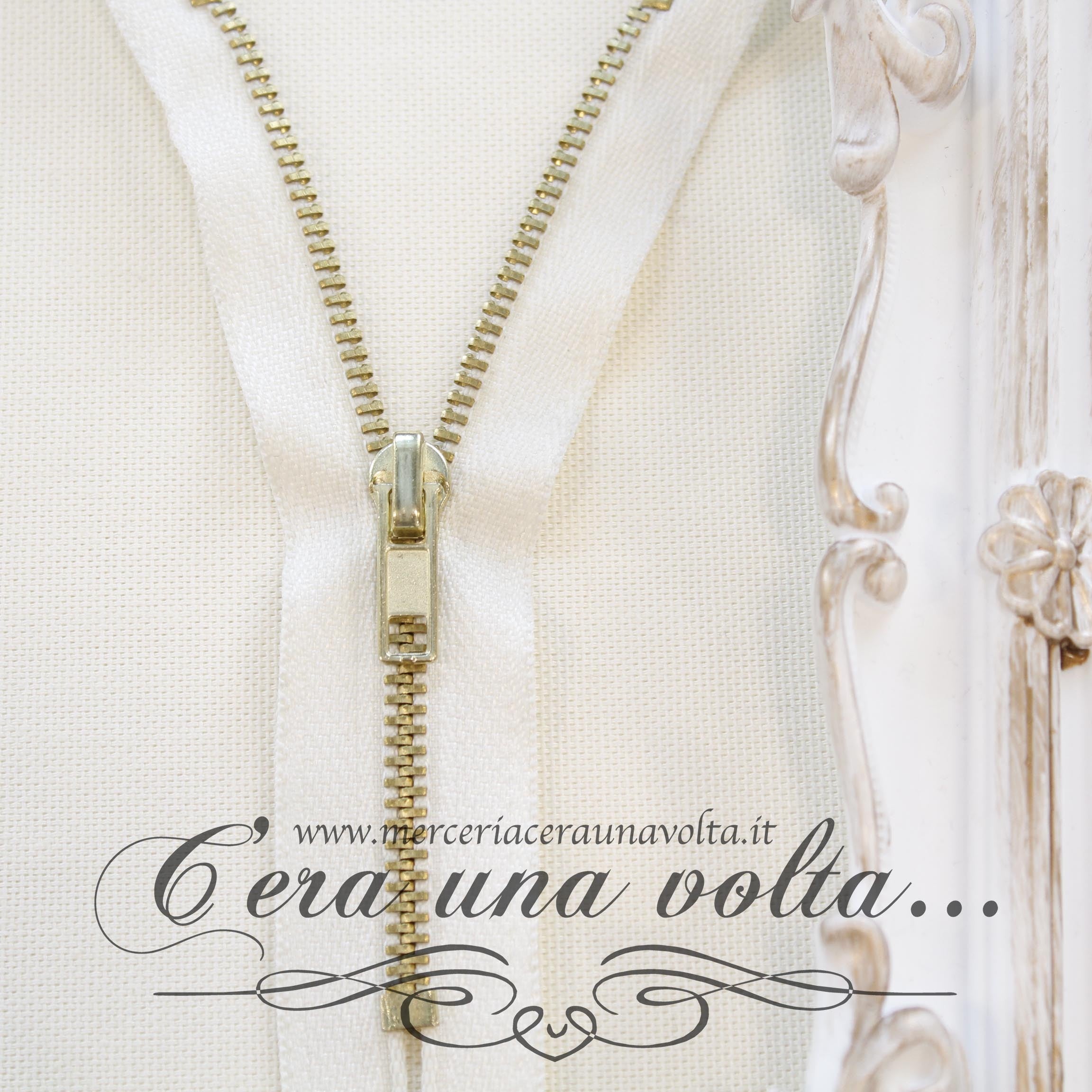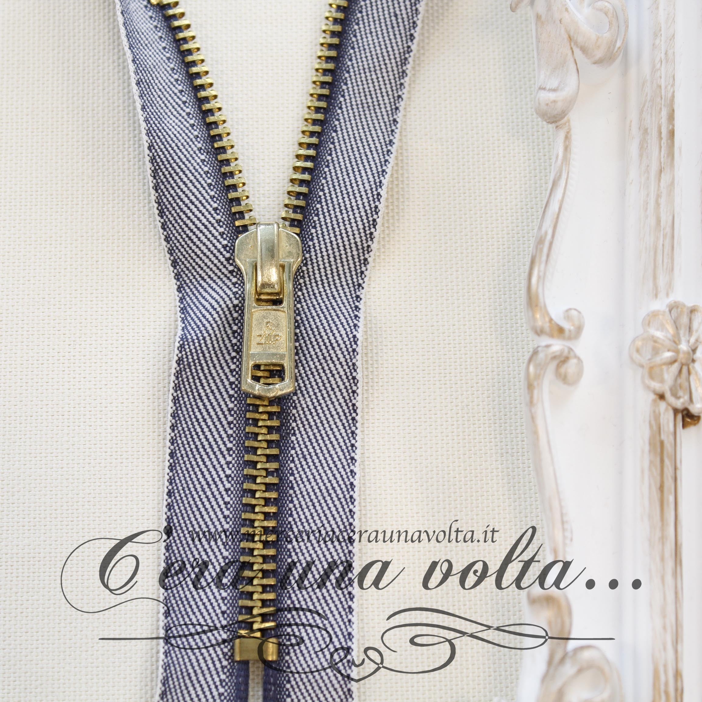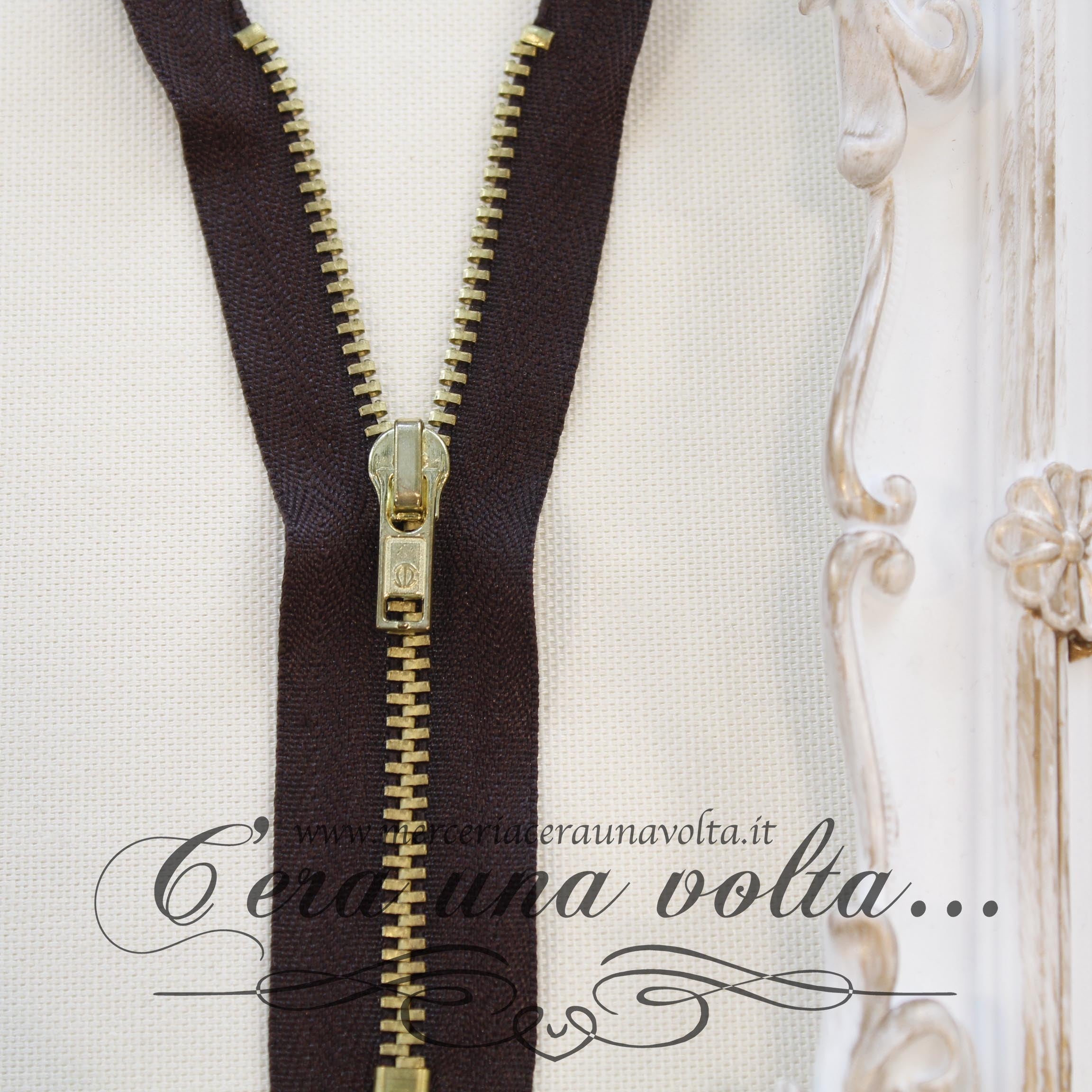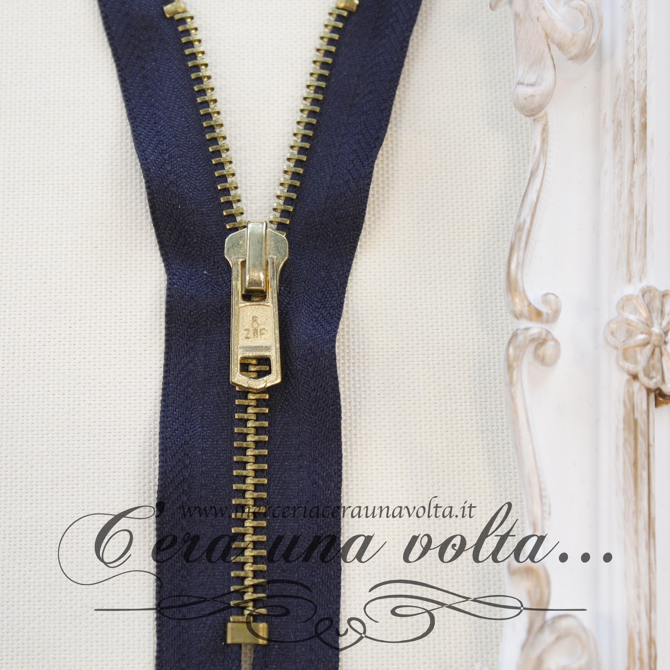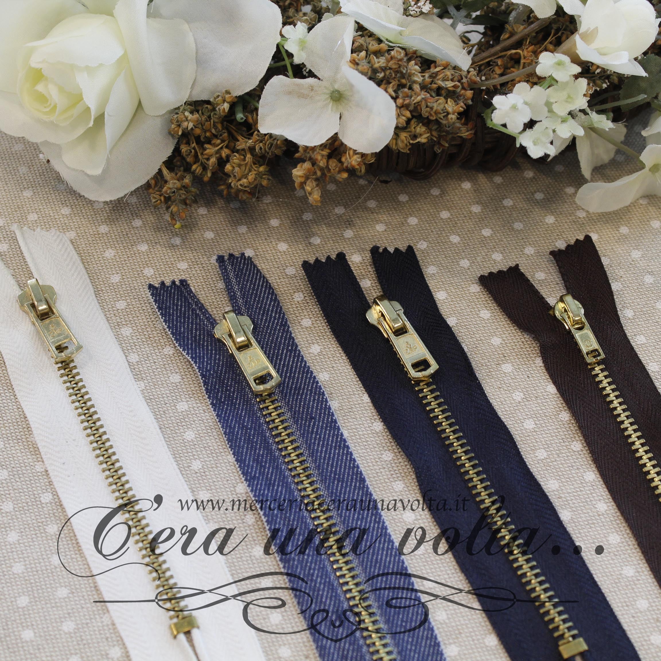Zip in metallo per pantaloni, catena con dentini in metallo, tranciati e graffati direttamente sui nastri in cotone di supporto, leggera ma resistente è ideale per l'abbigliamento sportivo e per accessori. La parte terminale è munita di un fermo che ne impedisce l'apertura. Disponibile in 2 misure e 12 colori