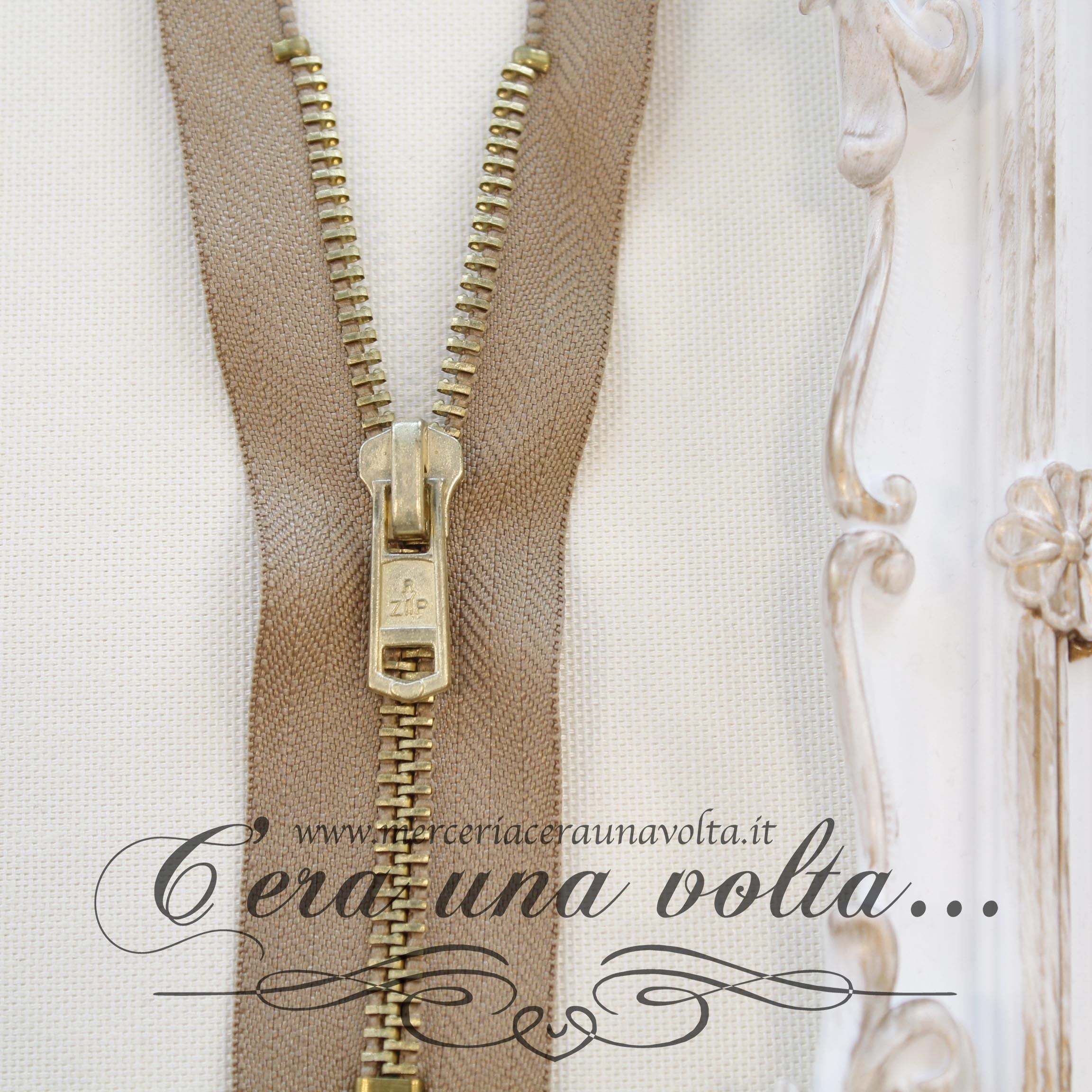 Zip in metallo per pantaloni, catena con dentini in metallo, tranciati e graffati direttamente sui nastri in cotone di supporto,...